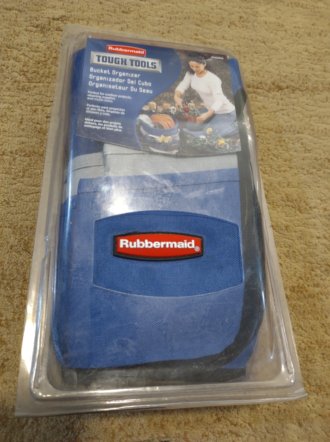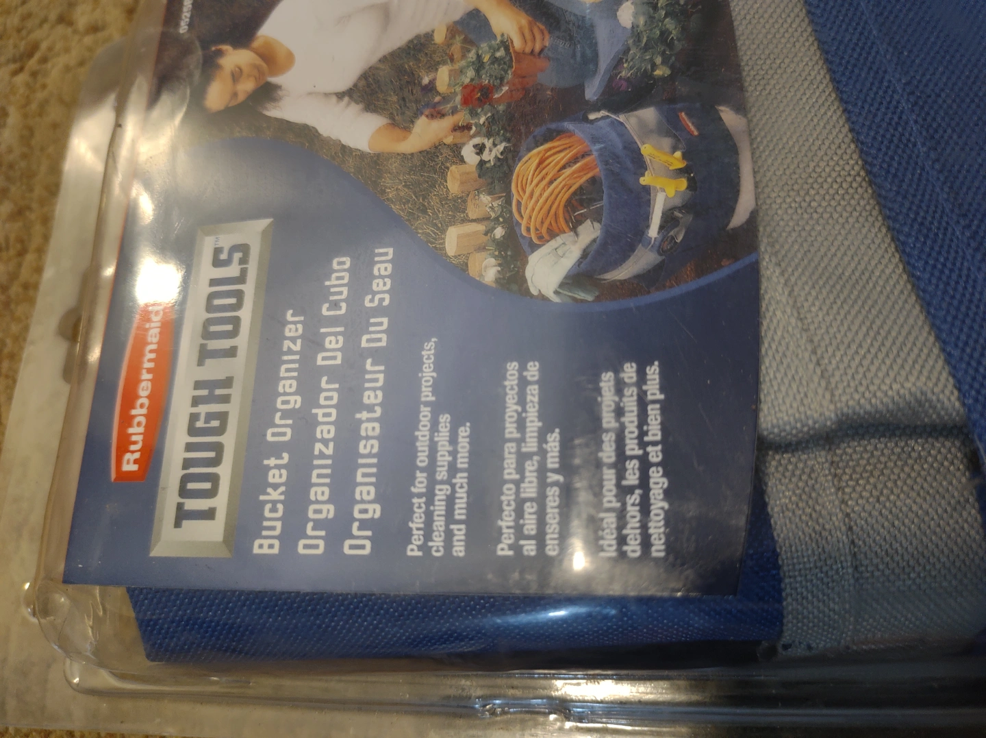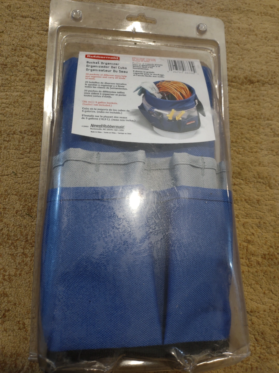 44New in package. Blue fabric bucket organizer. Multiple pockets. Ideal for outdoor projects.