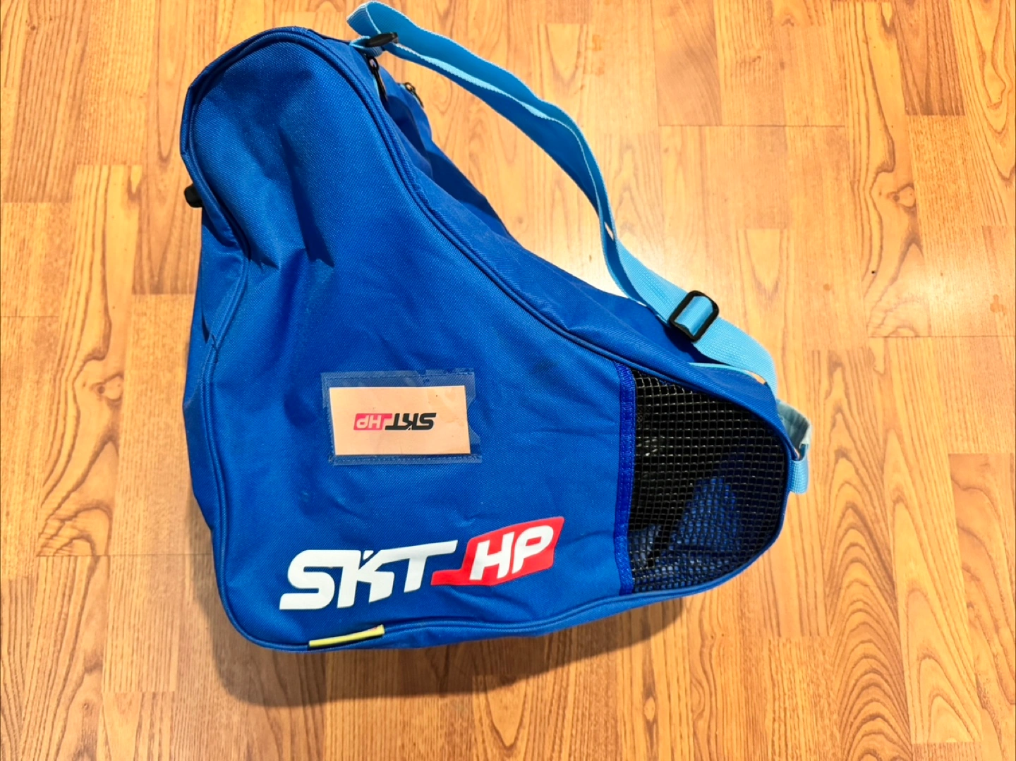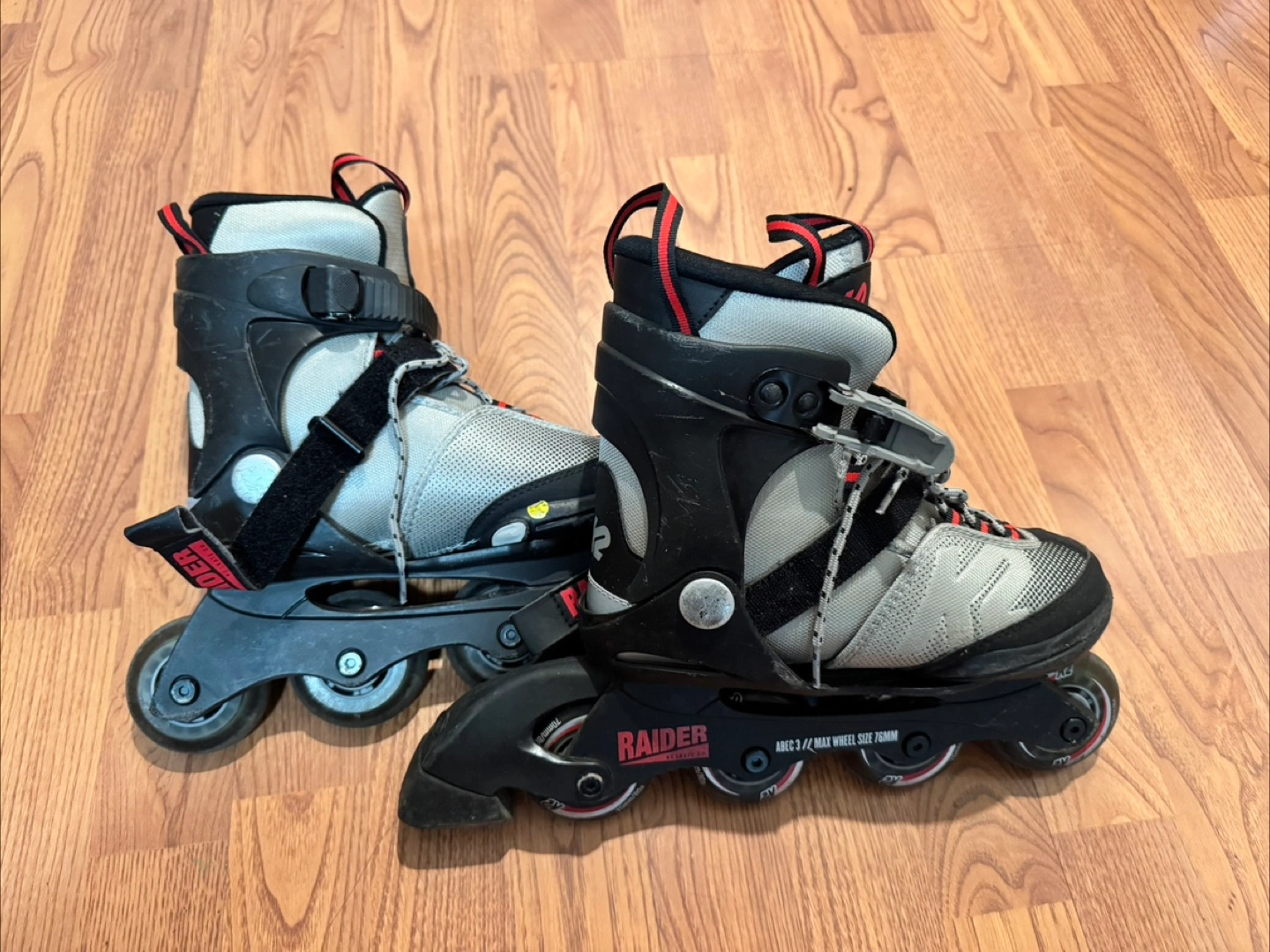 K2 Boy's inline skates, size adjustable. Gray and black with red accents. Includes a blue SKT HP skate bag. Wheels and components appear to be in good condition.