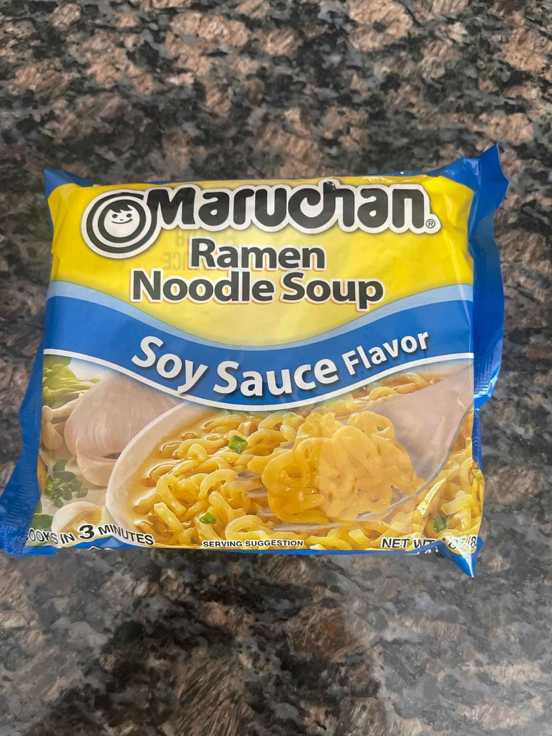 Single package of Maruchan Ramen Noodle Soup, Soy Sauce flavor. Cooks in 3 minutes.