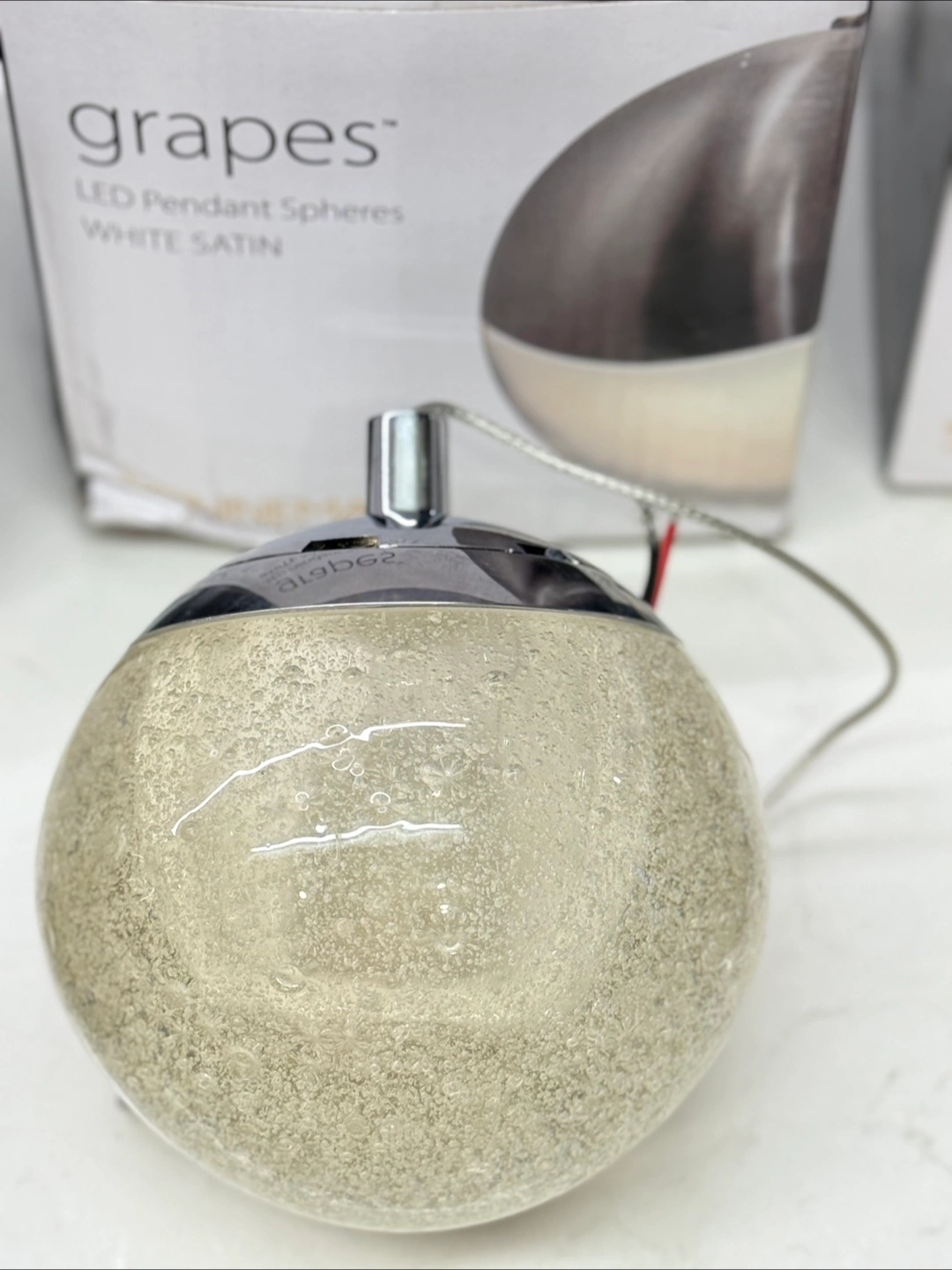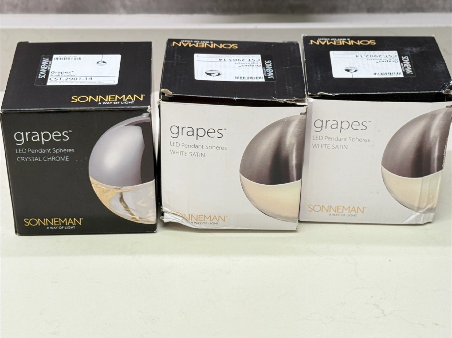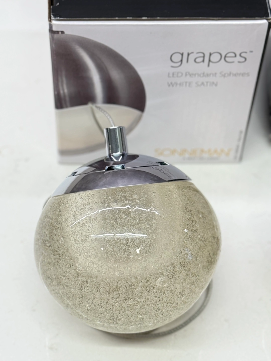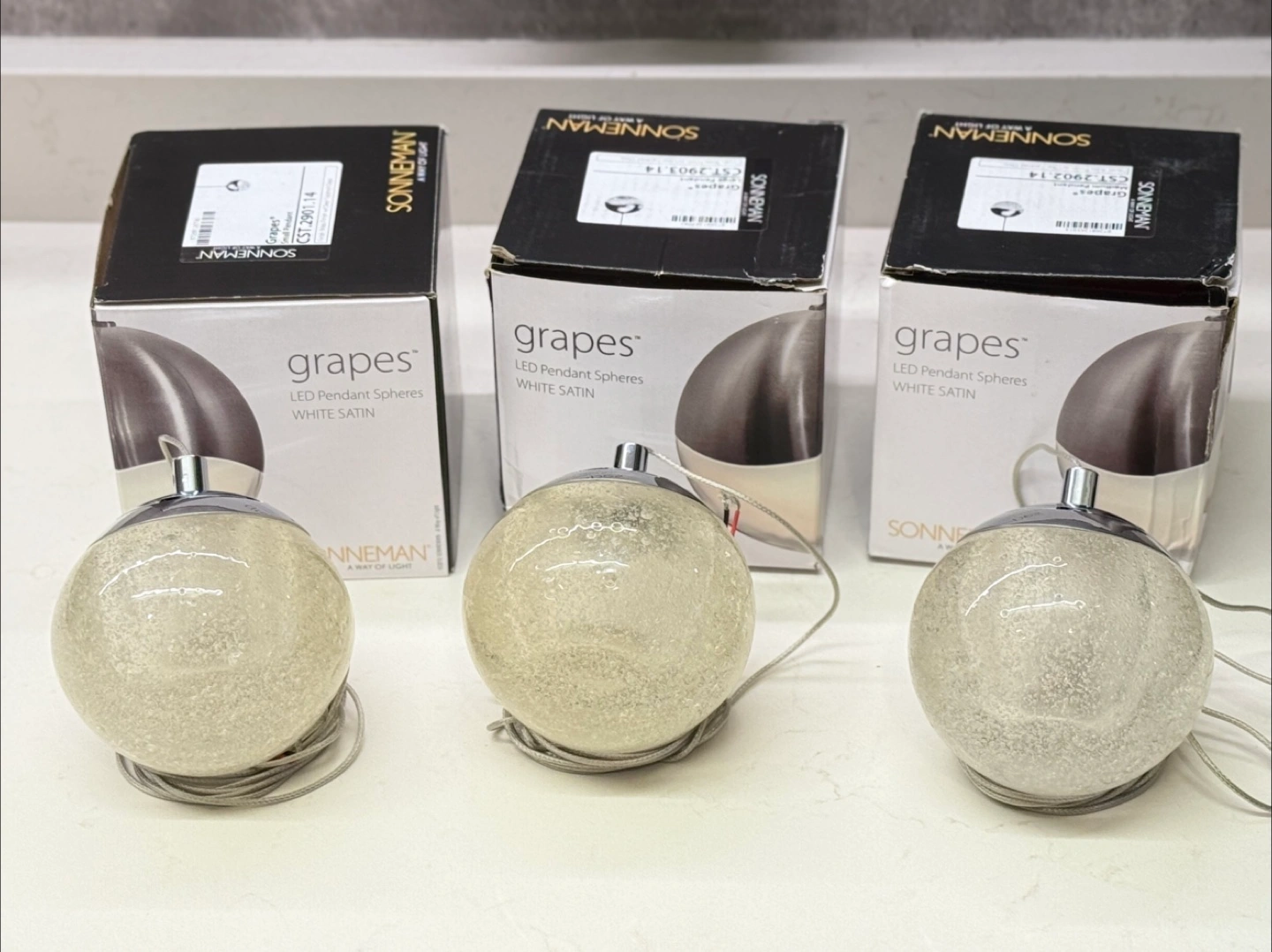 1000+Three Sonneman Grapes LED pendant lights. White satin finish. New in box. Perfect for modern or contemporary decor. Used for a showroom Presentation and now selling for low price. Solid glass lamp bulbs 12” diameter and over 60” of wire. Selling for $10 each. 2 lamps in left have a slightly more yellow appearance but we hung them all together and I never noticed until now.