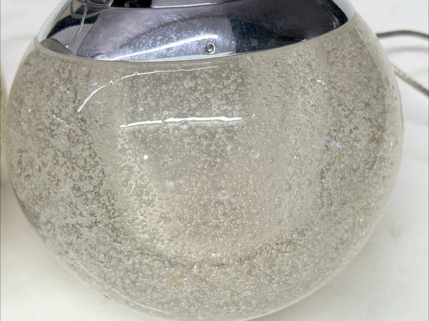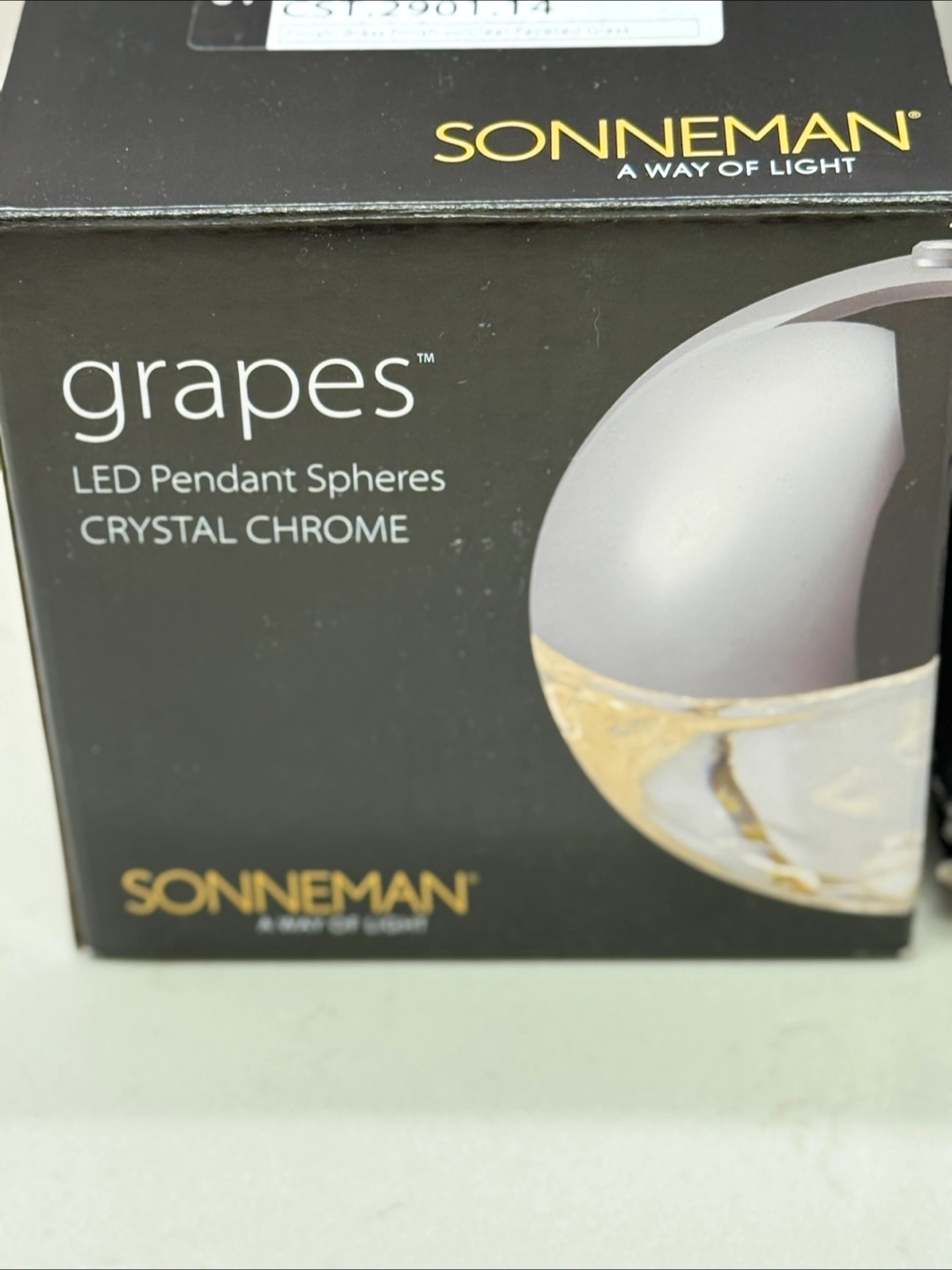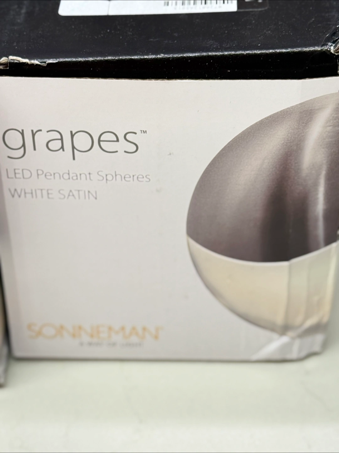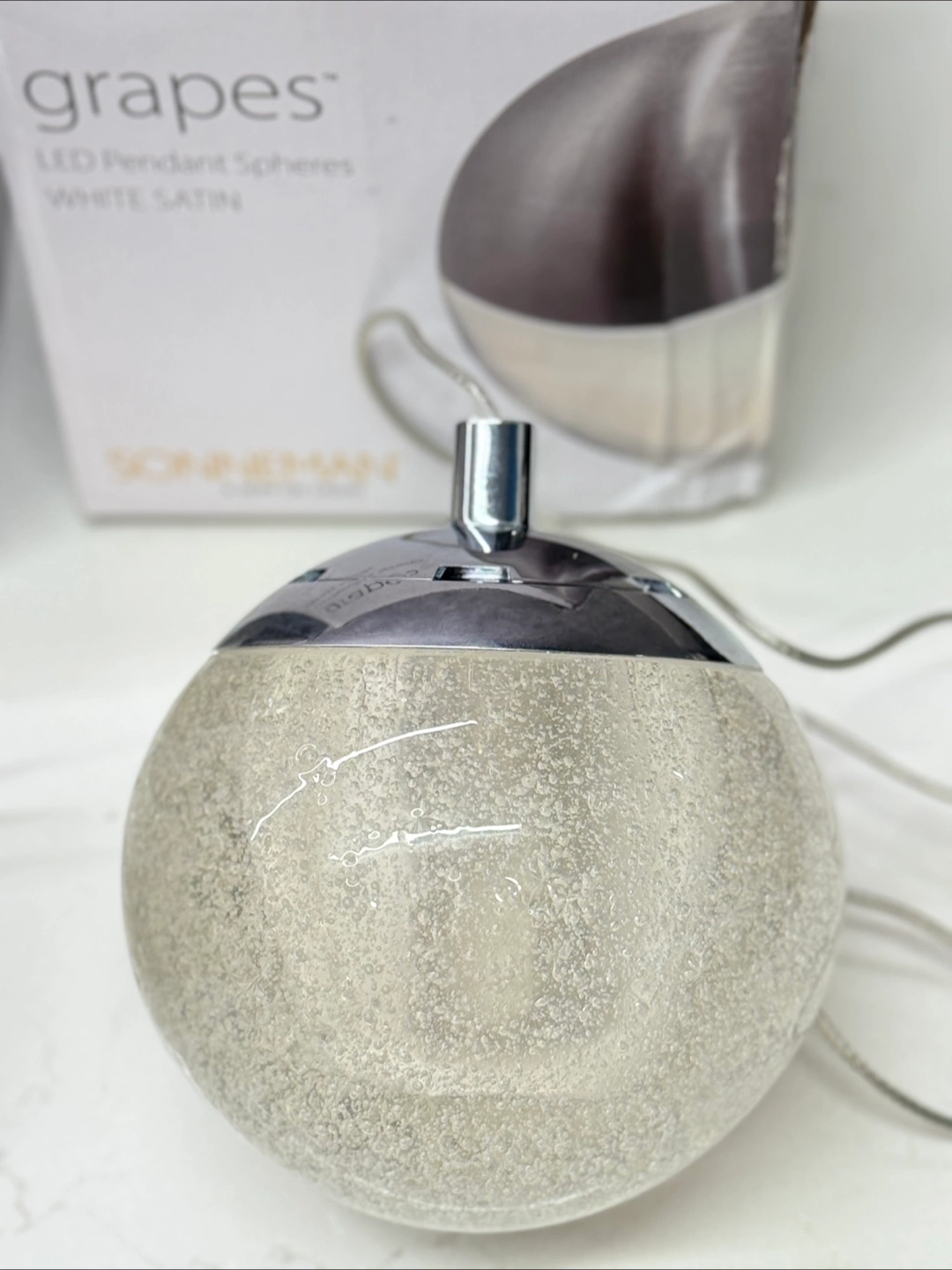1000+Three Sonneman Grapes LED pendant lights. White satin finish. New in box. Perfect for modern or contemporary decor. Used for a showroom Presentation and now selling for low price. Solid glass lamp bulbs 12” diameter and over 60” of wire. Selling for $10 each. 2 lamps in left have a slightly more yellow appearance but we hung them all together and I never noticed until now.