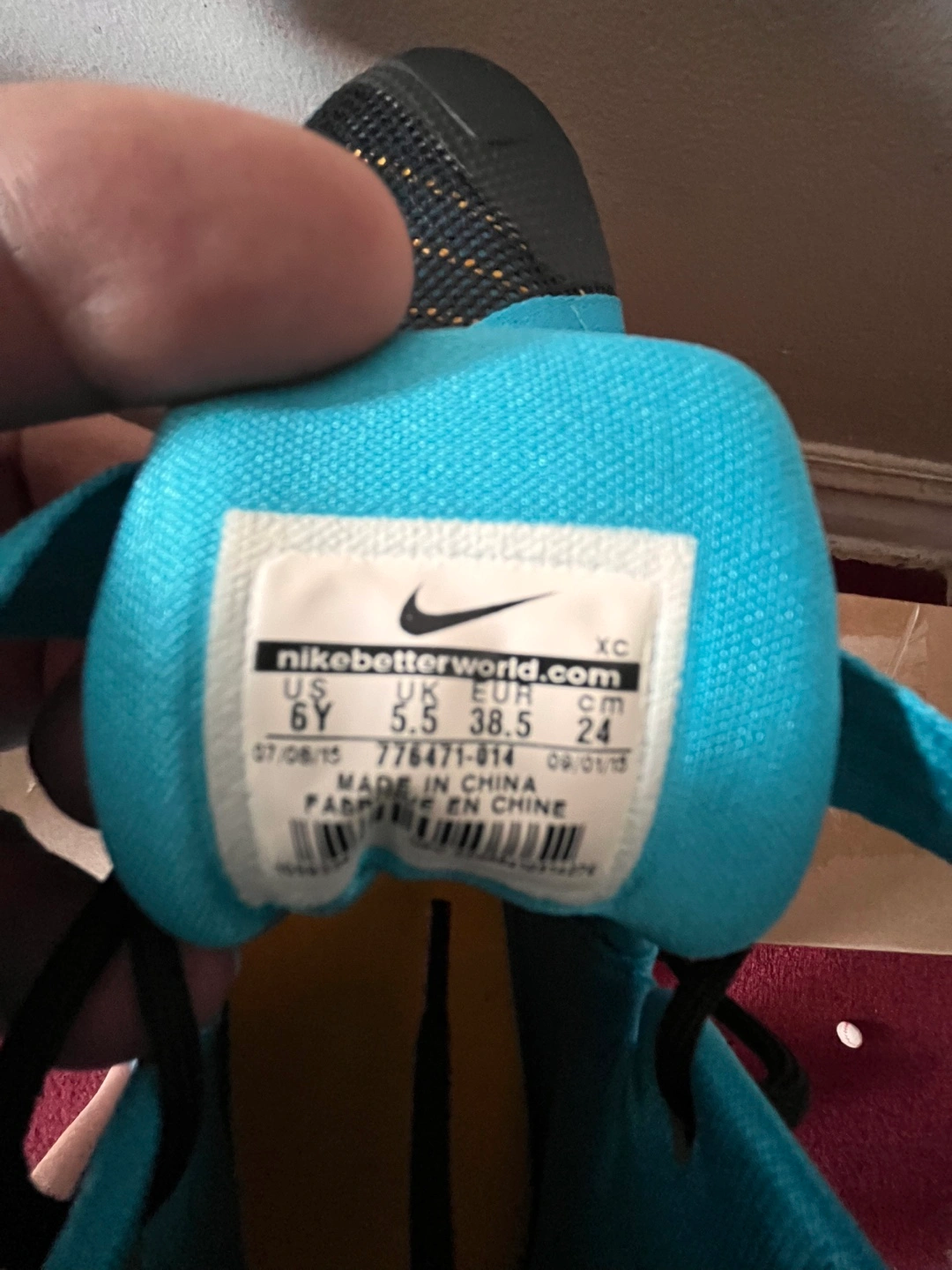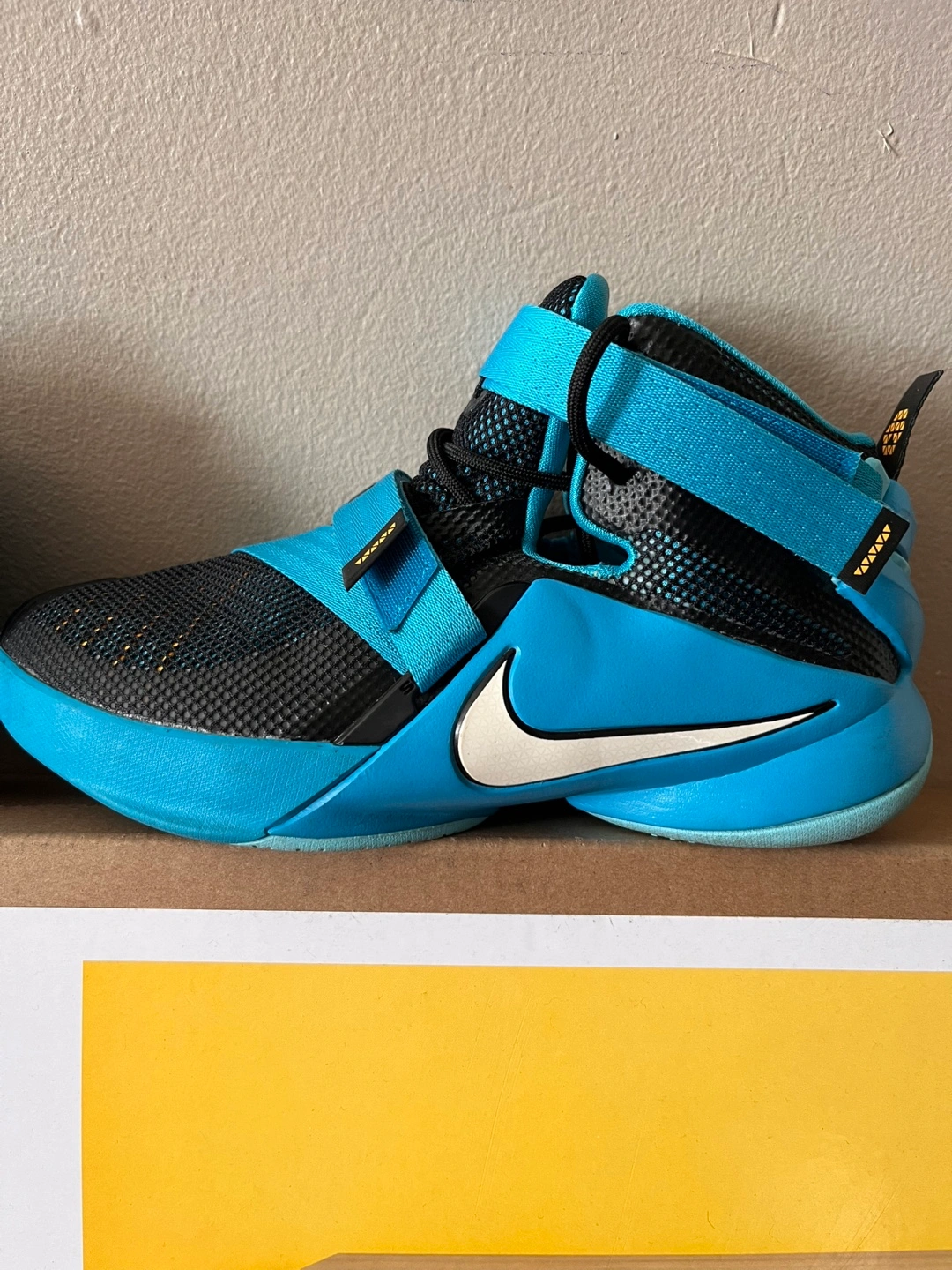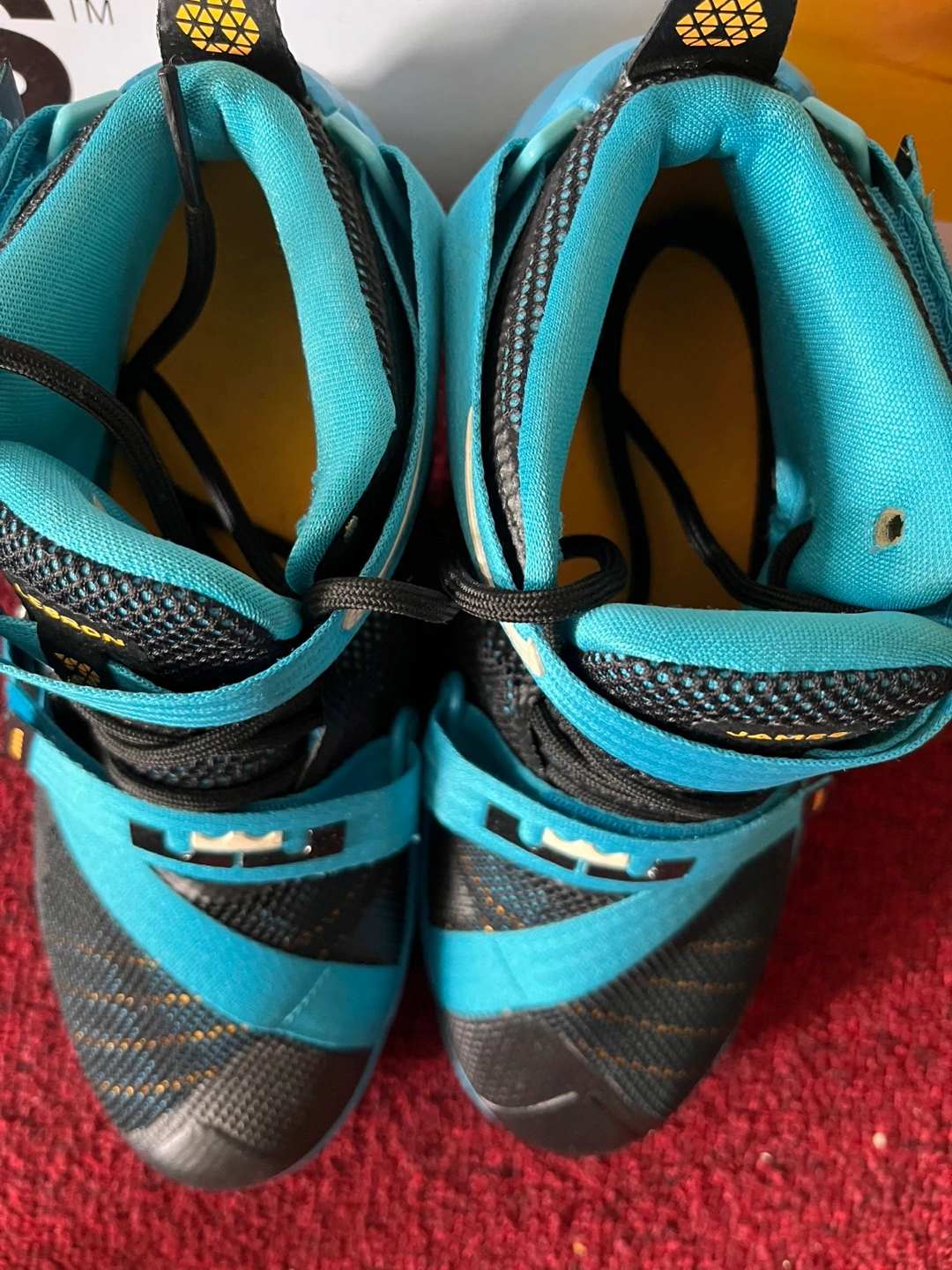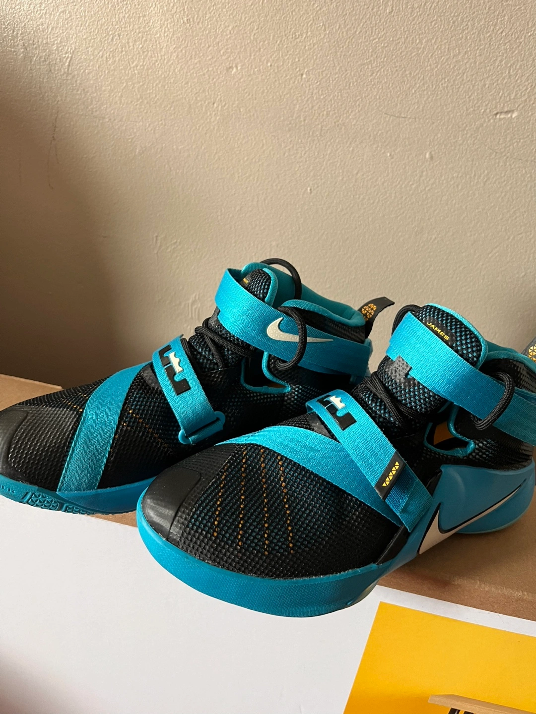 26Pre-owned Nike LeBron Soldier 8 basketball shoes. Youth size 6Y. Black, teal, and gold colorway. Strap closure. Show some wear.