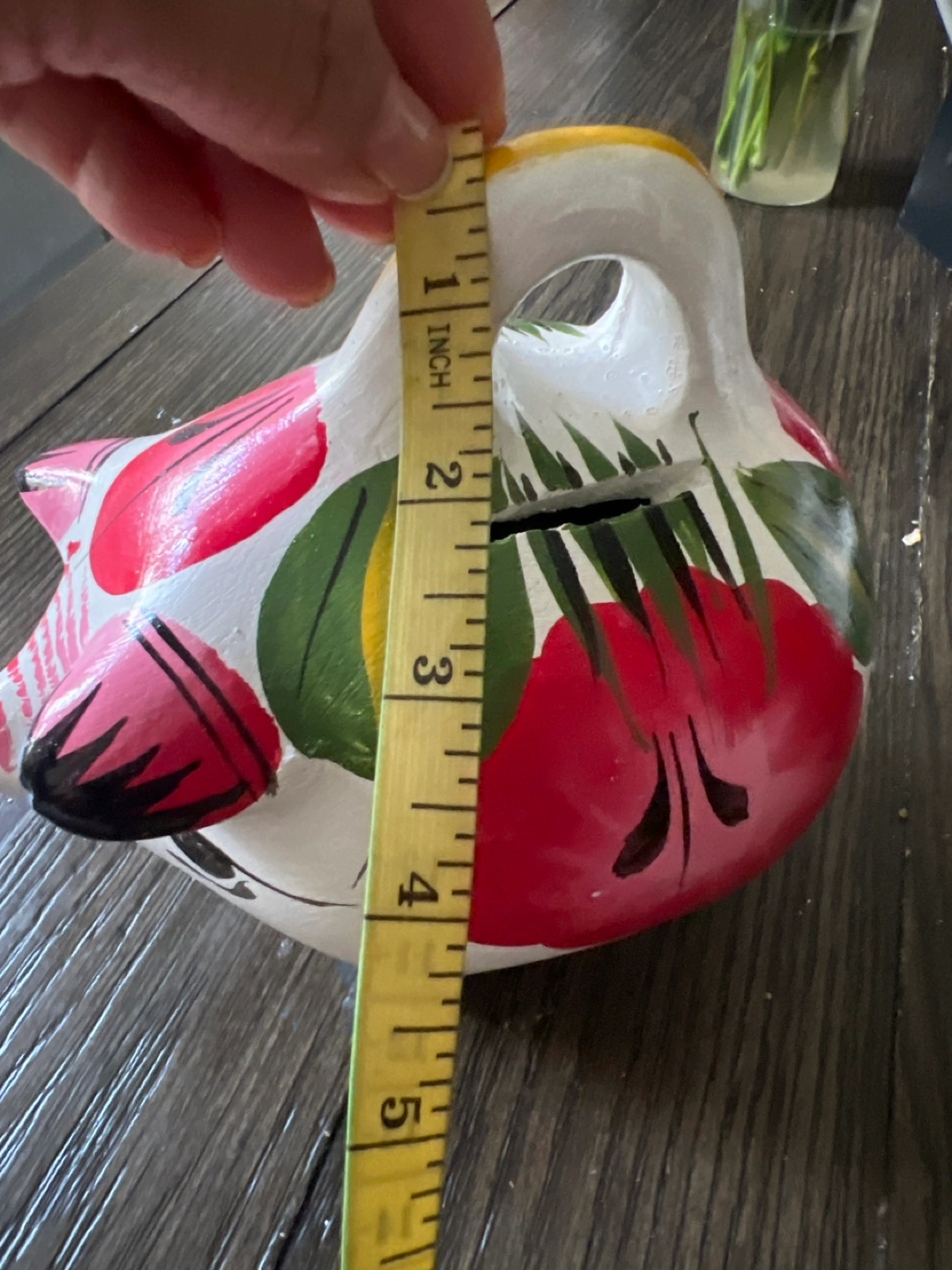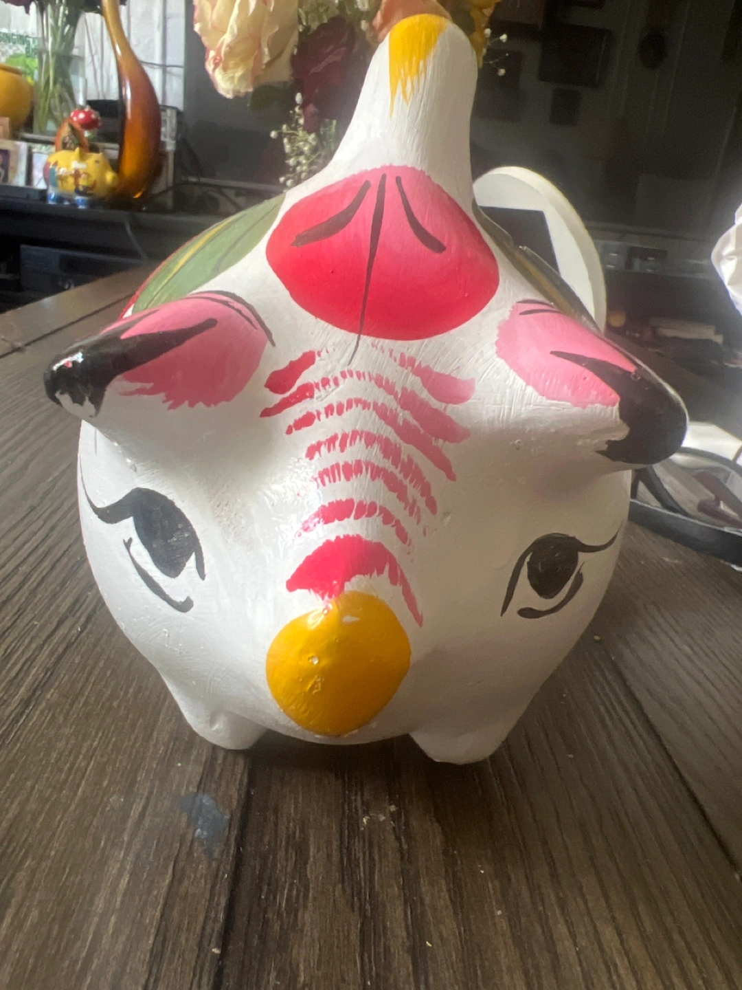 Adorable piggy bank. Hand-painted ceramic. Features red and green floral designs. Approximately 5 inches tall. Small coin slot on top.