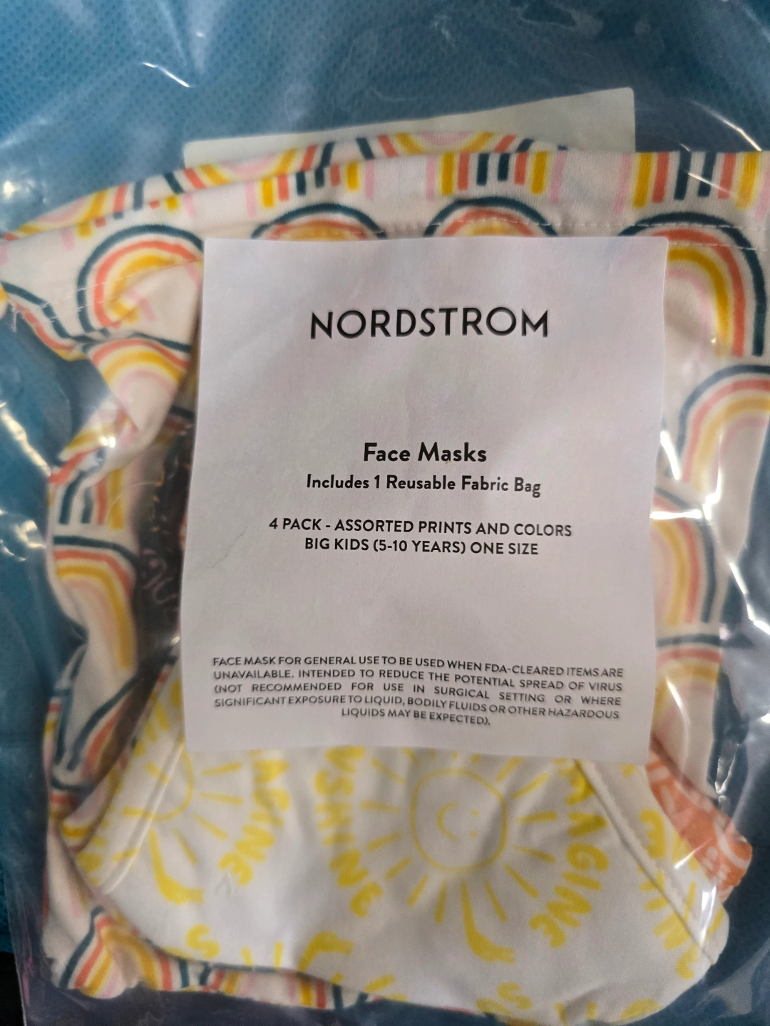 1000+4 pack of kids face masks. Assorted prints and colors. One size fits kids (5-10 years). Includes reusable fabric bag. Sold by Nordstrom.