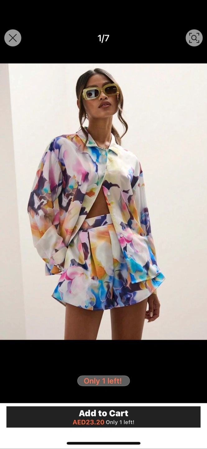 707Matching shirt and shorts set. Abstract floral print. Loose-fitting shirt. High-waisted shorts. Perfect for summer.