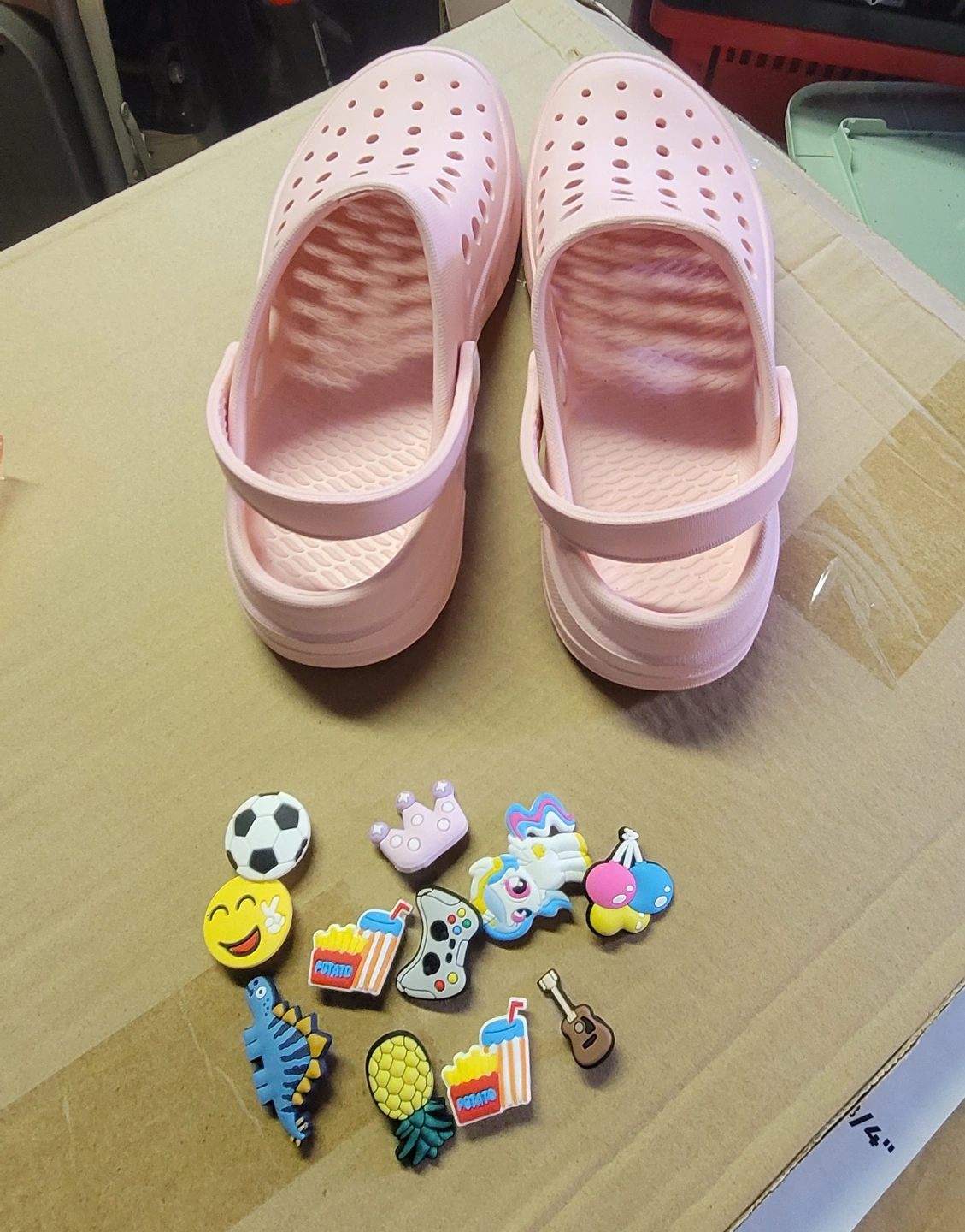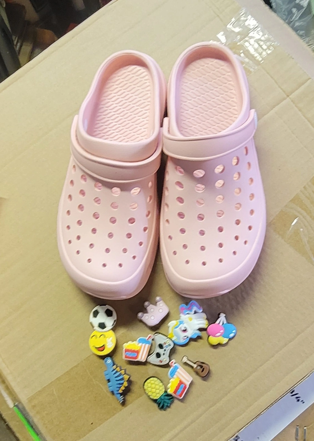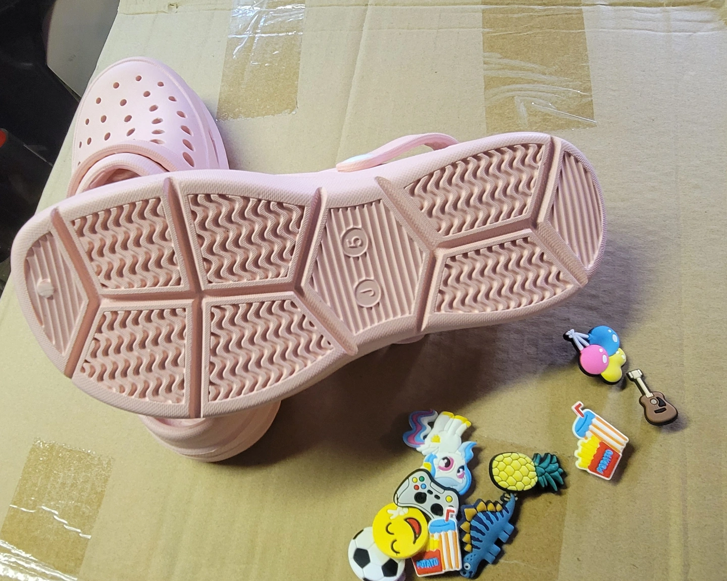 New Pair of pink shoes. Kids Size 5, Includes multiple Jibbitz charms. Great for summer. Pickup in River Grove