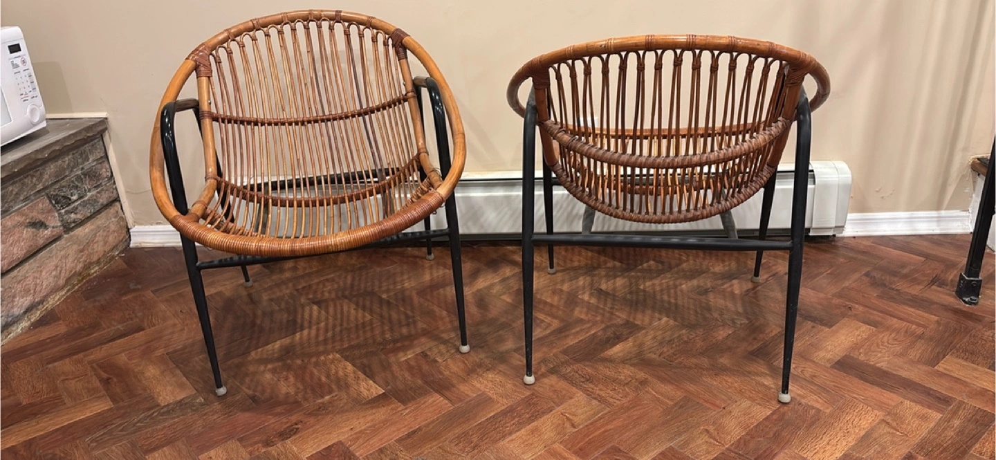 10Two classic vintage rattan “hoop” chairs. Black metal legs and frame. Round seats and backs. Mid-century modern style. Good for living room or dining room. Slight damage of rattan on one chair in need of repair.