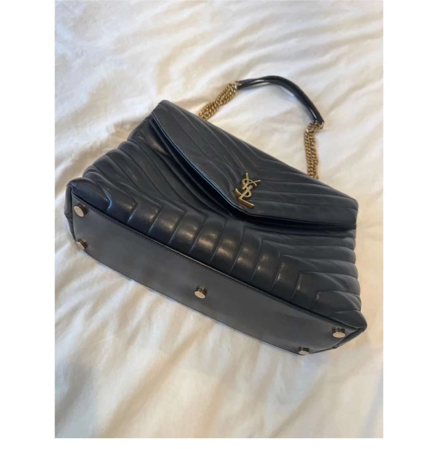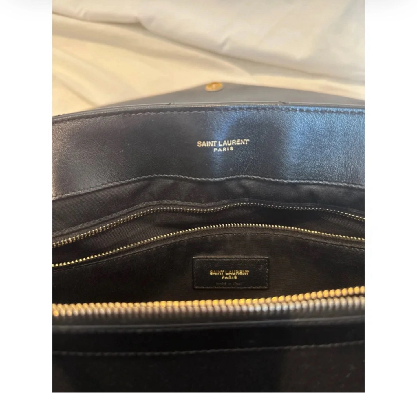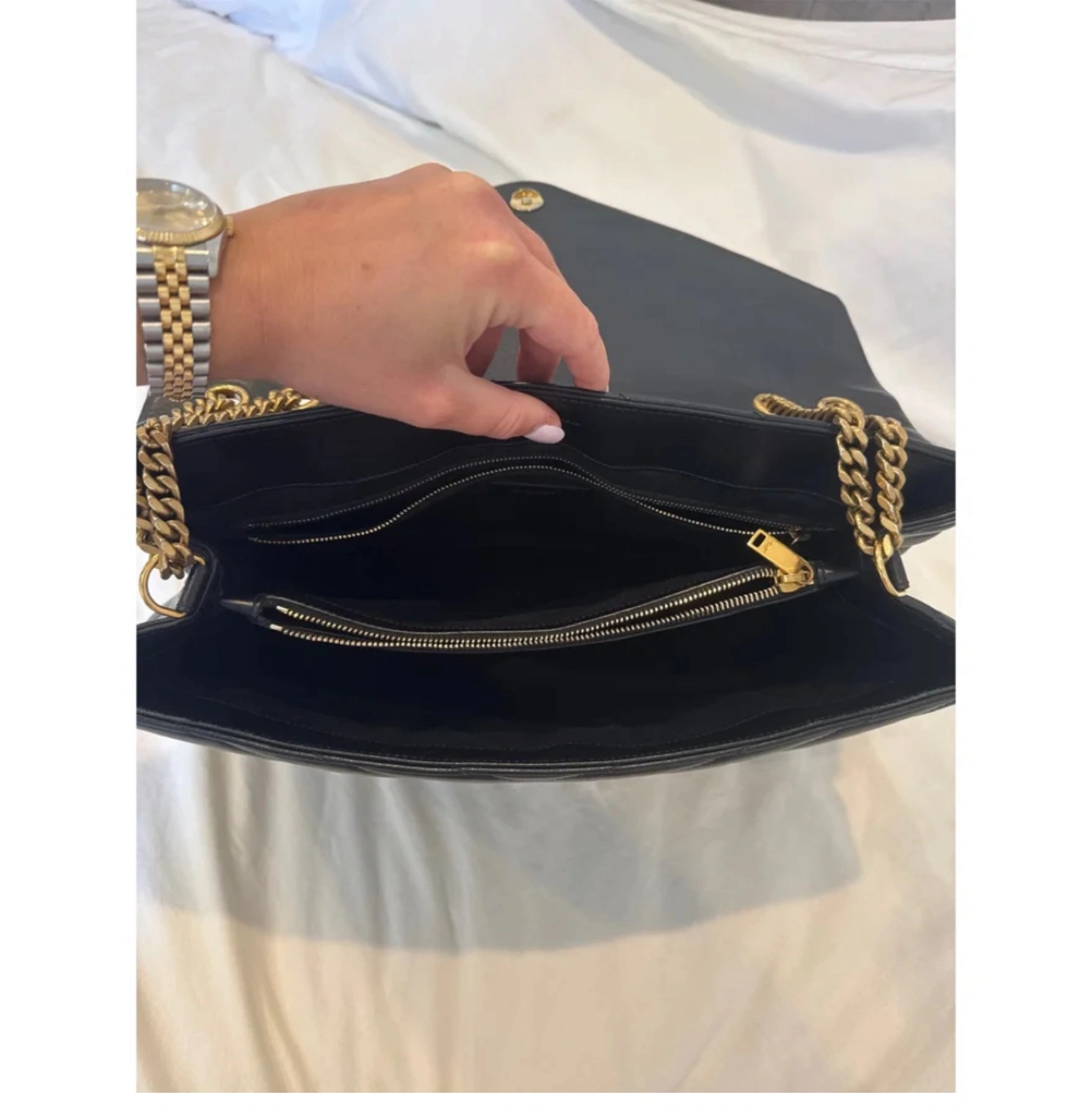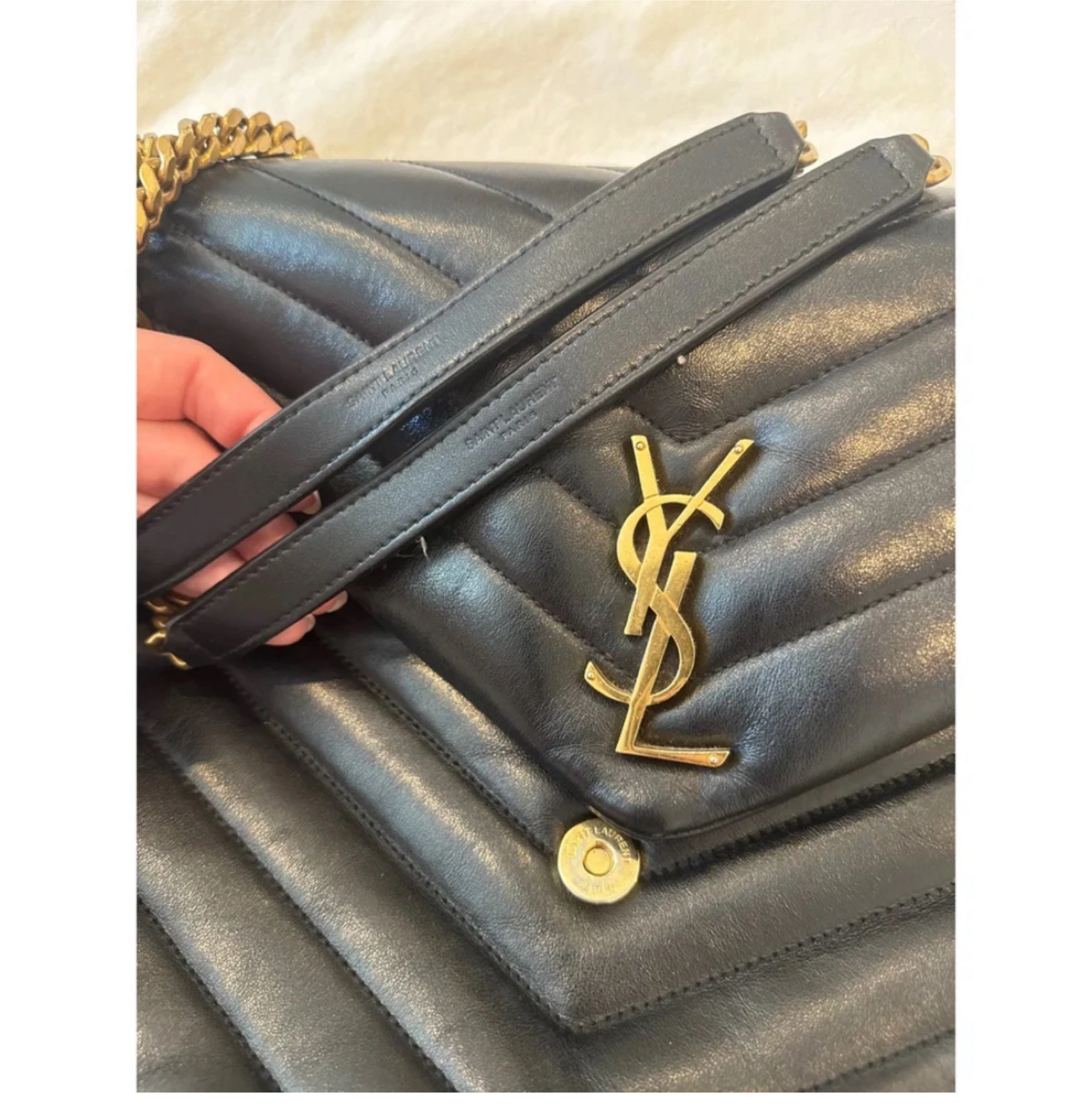Gorgeous black leather bag. Features gold chain strap and YSL logo. Multiple interior compartments. Pre-owned.