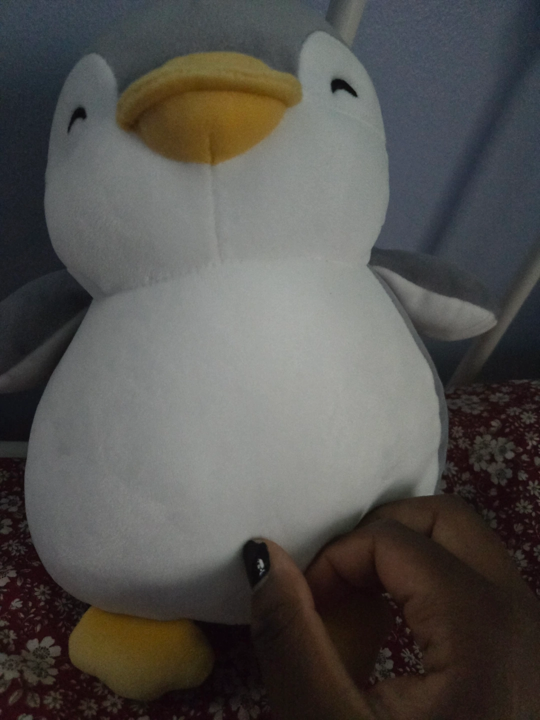 74Soft plush penguin. Gray and white. Yellow beak and feet. Great for kids or collectors. hole in the back