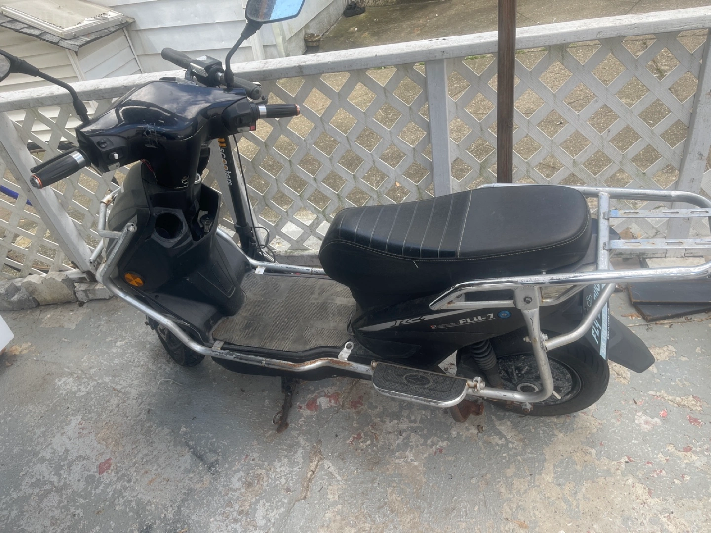Electric scooter. Black and silver. Features a rear cargo rack. Good condition. Needs a new battery and charger cable, Price Drop from 250 to 150
