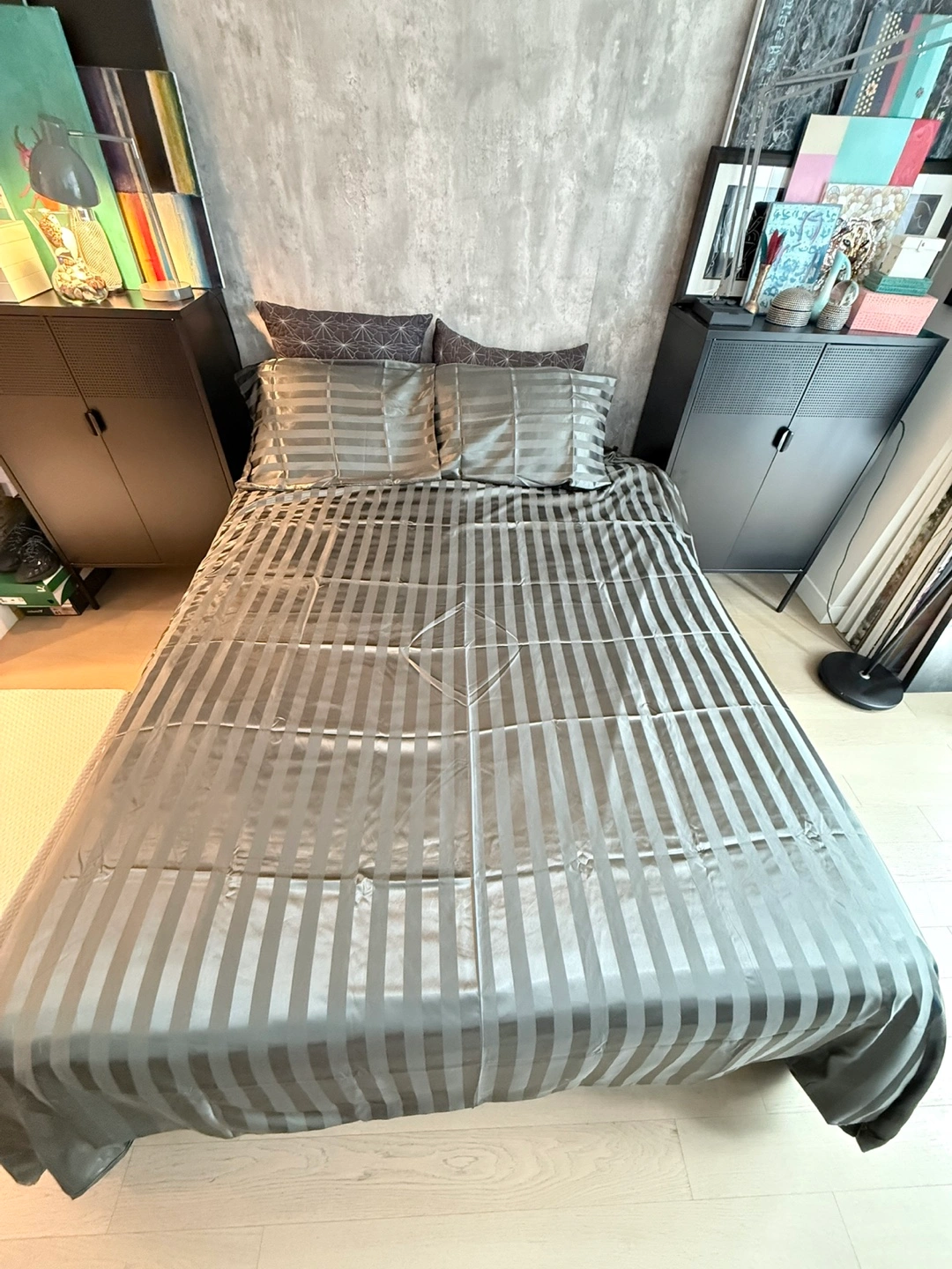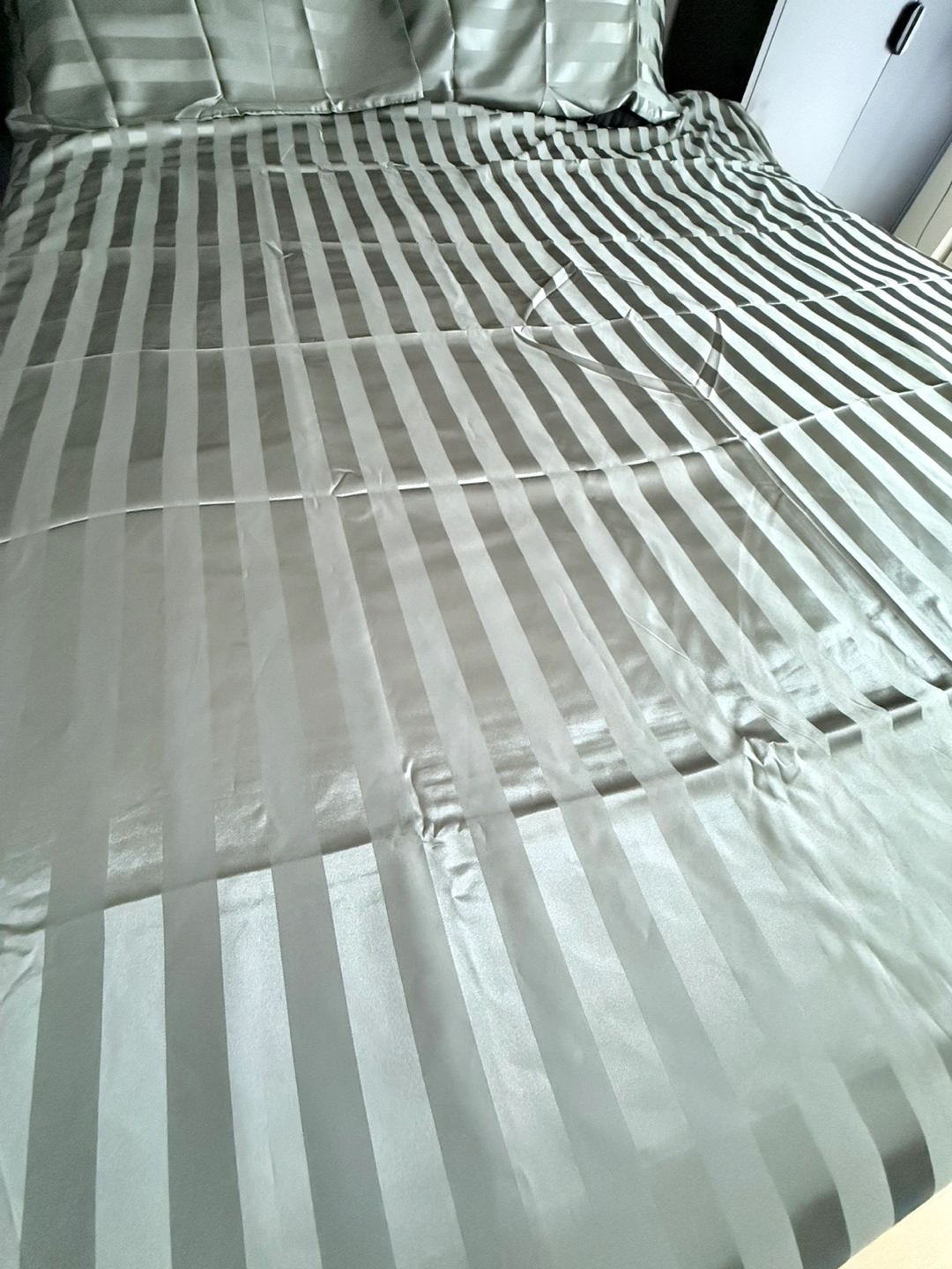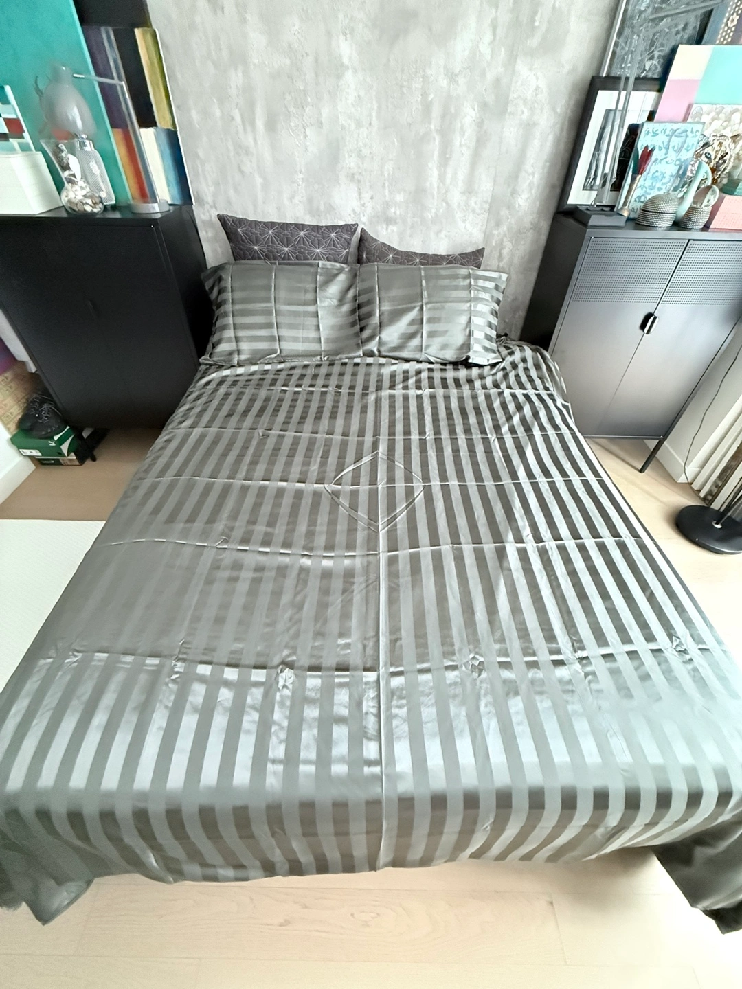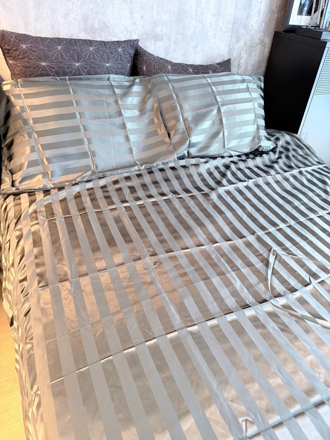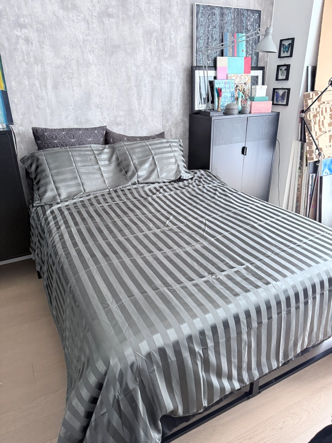 1000+New Gray Striped Satin queen Size Bed Duvet Cover with zipper closure & 2 cases Charcoal Gray and Satin Grey vertical stripes. Soft and comfortable material. Condition: new in package, creases are from being folded in package. Selling because of color doesn’t match my room.
