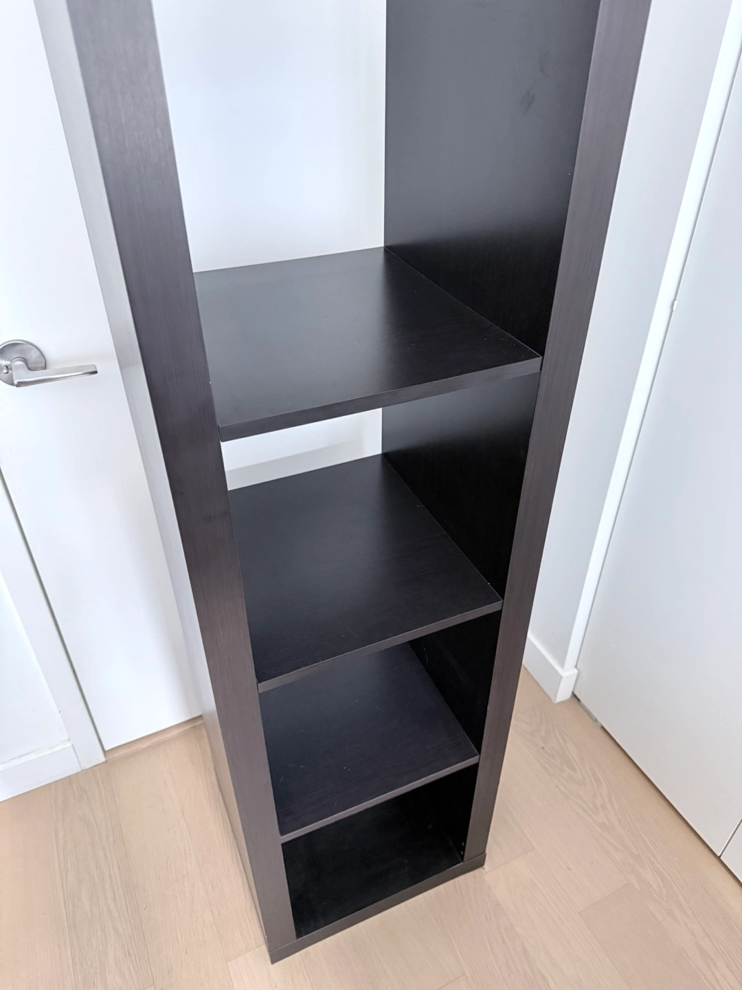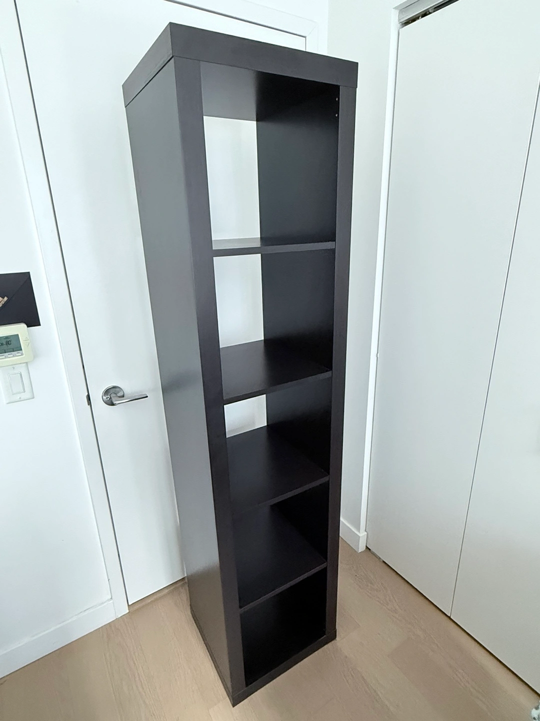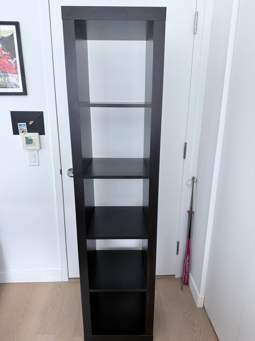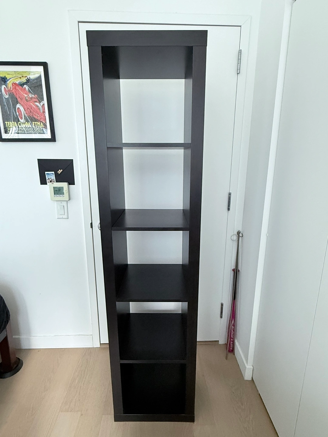 1000+Tall, narrow shelving unit. Five open shelves. Dark brown finish. Perfect for books, decor, or storage. Dark brown wood-look finish. Condition is good. Can be unassembled for pick up and travel. Elevator and garage entrance too. Dimensions: 17.5” Wx 15.5”Dx 72”H