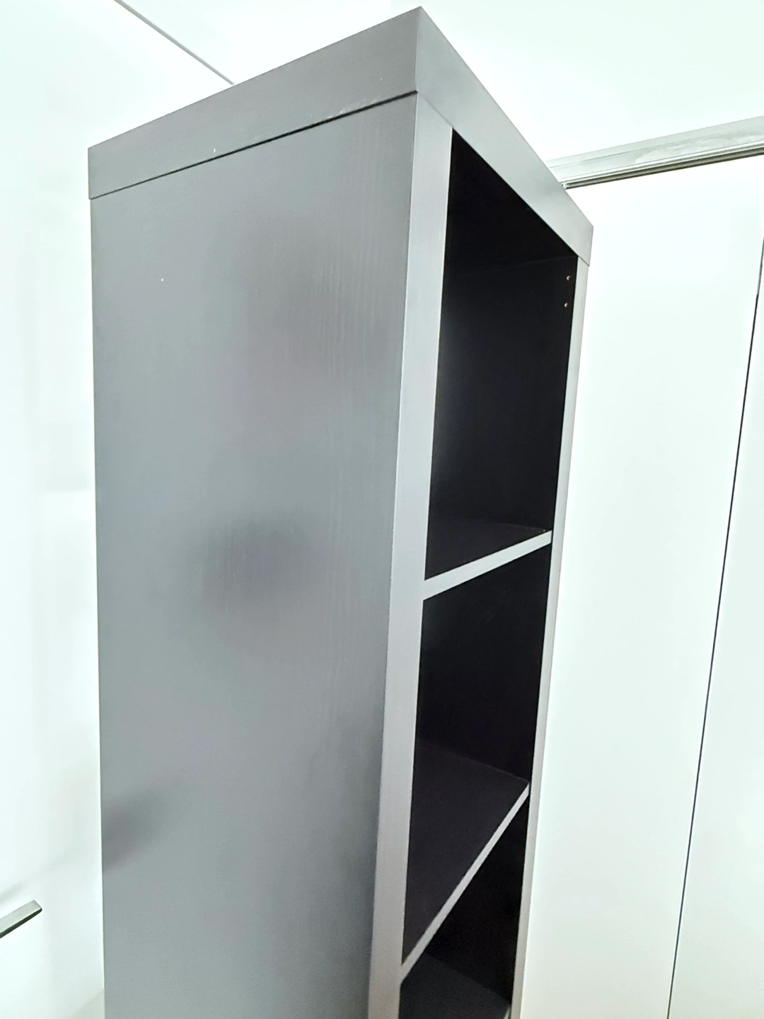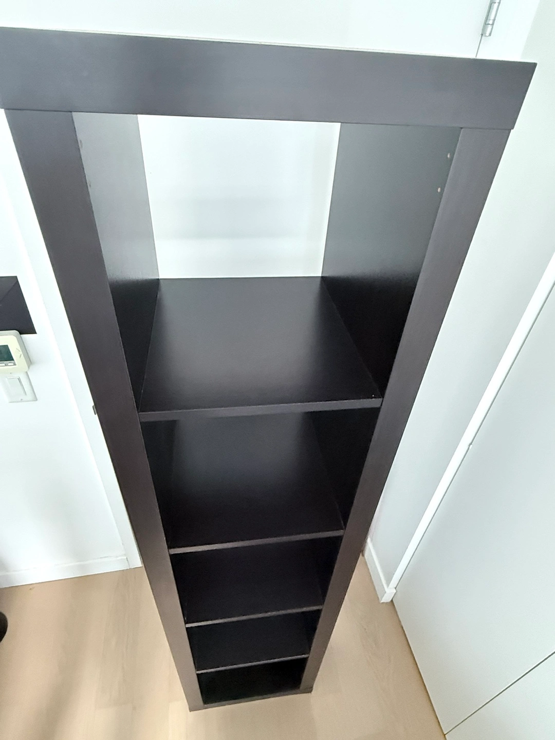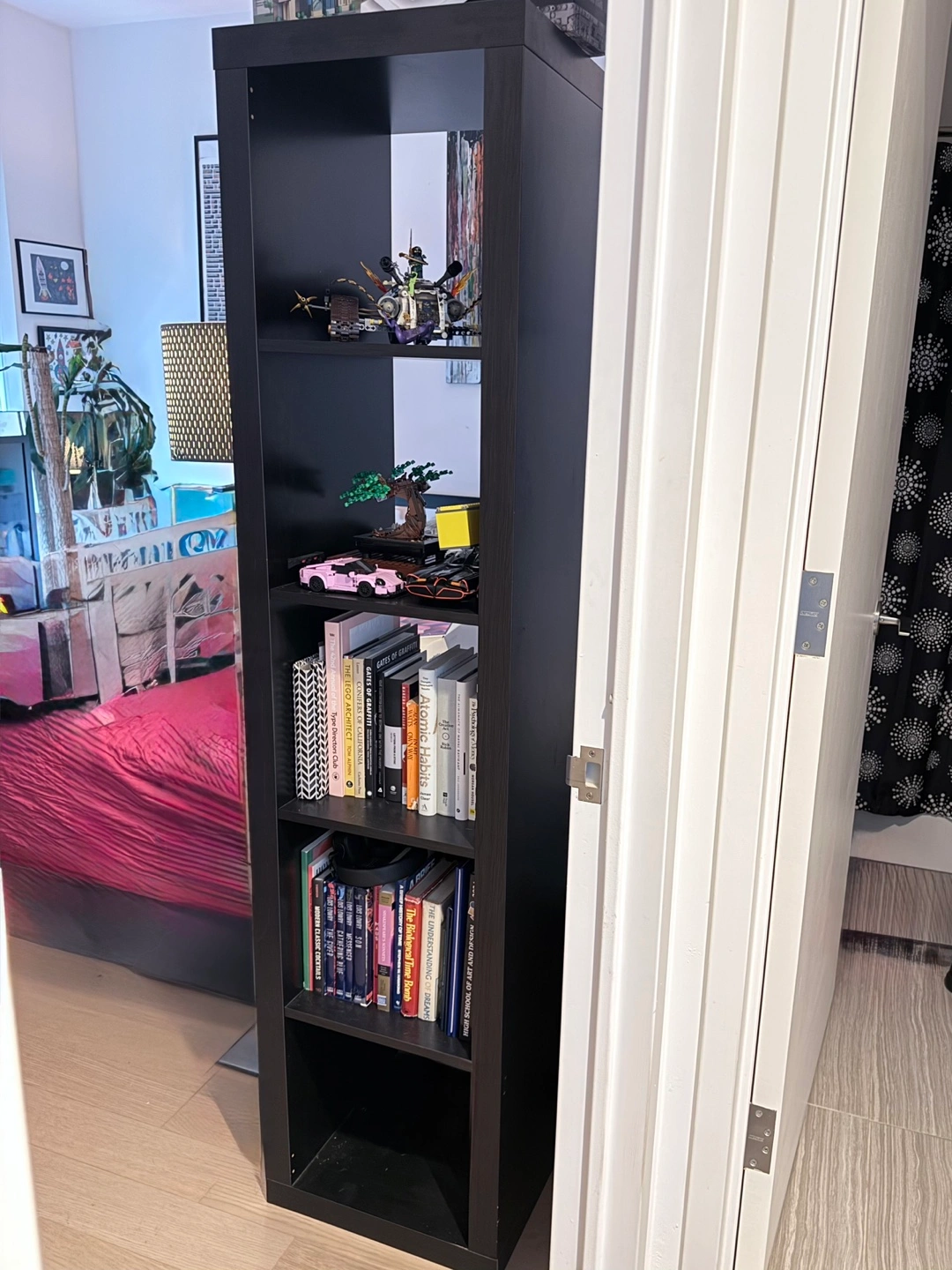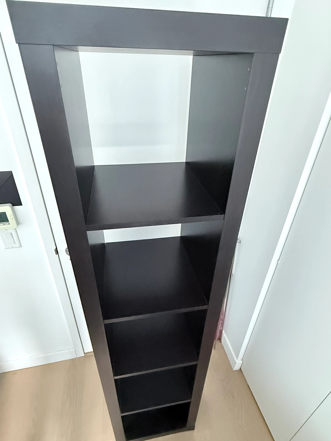 1000+Tall, narrow shelving unit. Five open shelves. Dark brown finish. Perfect for books, decor, or storage. Dark brown wood-look finish. Condition is good. Can be unassembled for pick up and travel. Elevator and garage entrance too. Dimensions: 17.5” Wx 15.5”Dx 72”H