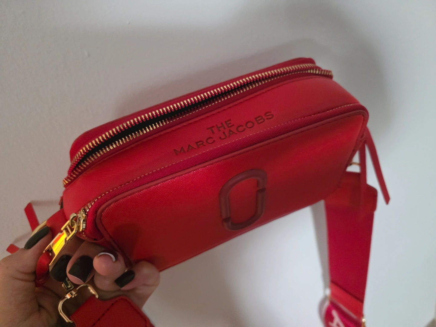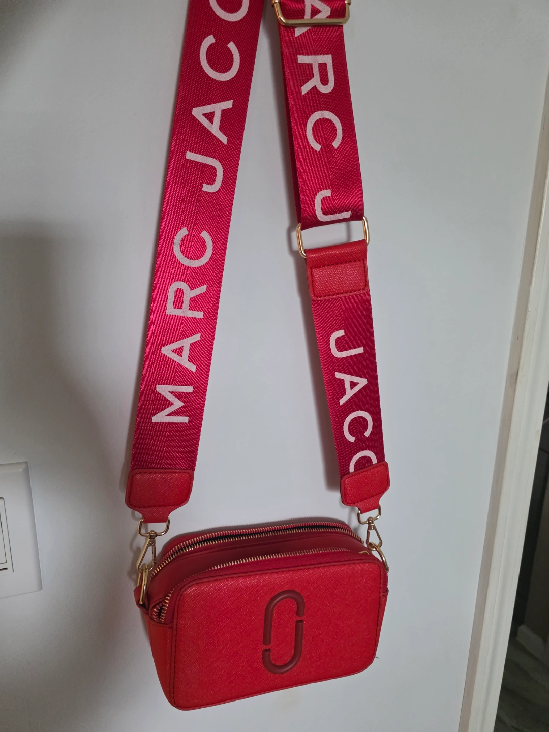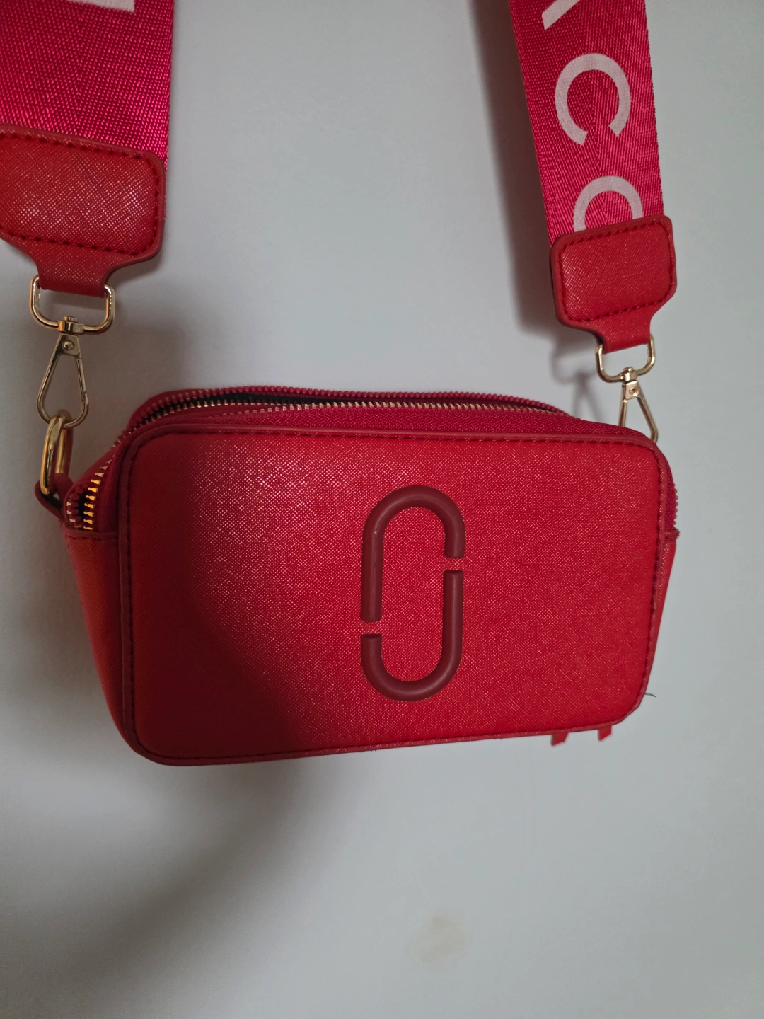 Red crossbody bag. Features gold hardware. Zip closure. Adjustable strap with Marc Jacobs branding. Small size, perfect for everyday use.