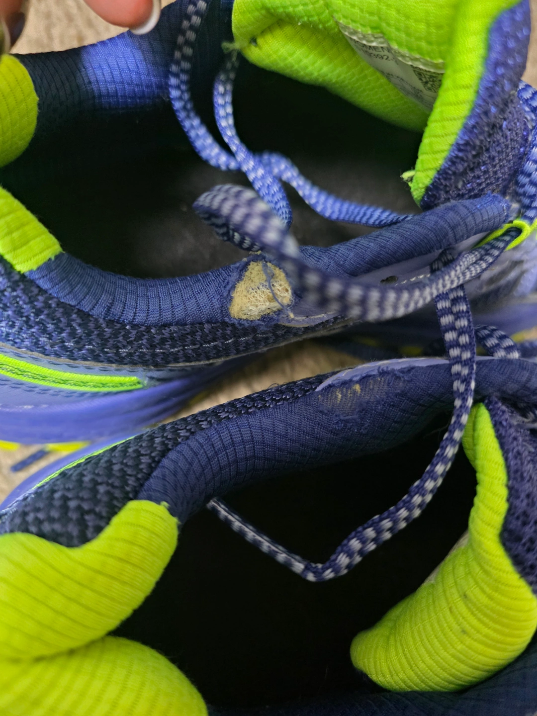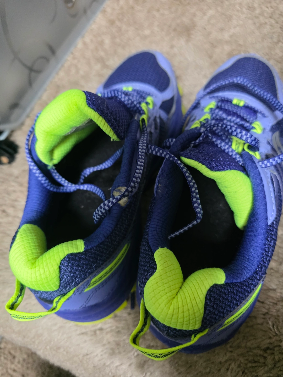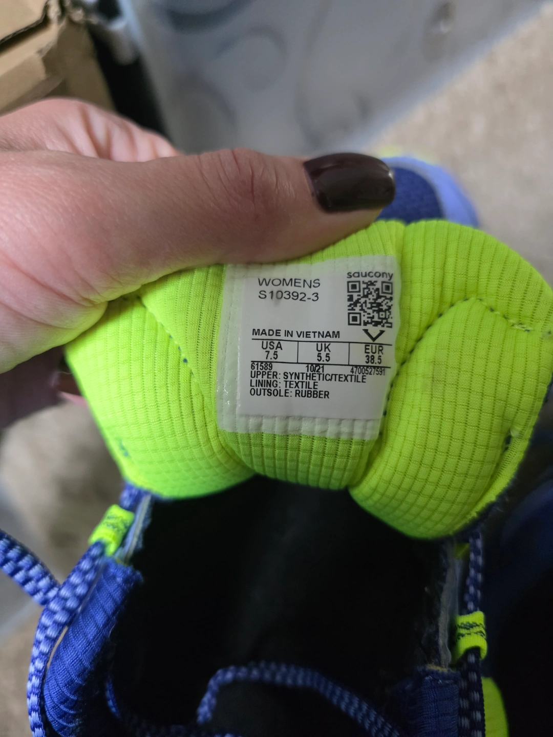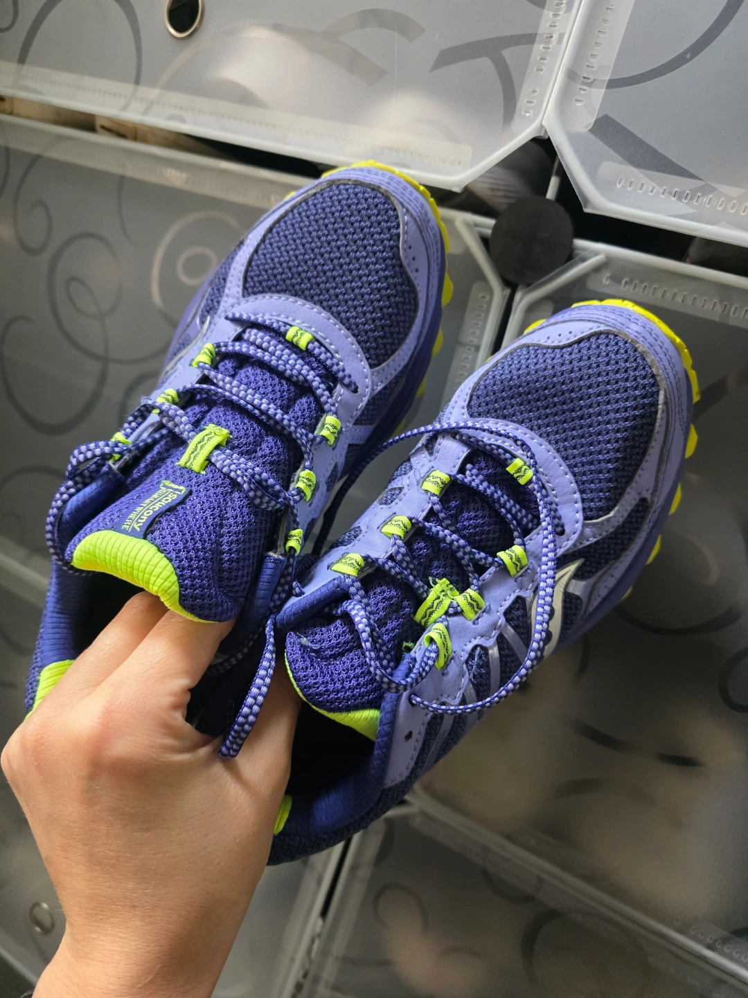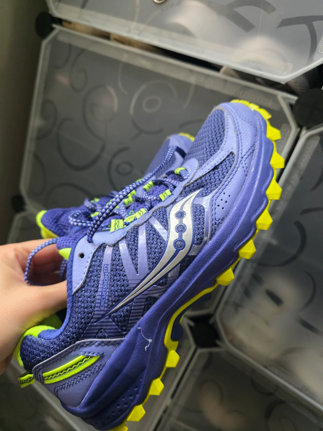 Worn Saucony trail running shoes. Size US 7.5, UK 5.5, EUR 38.5. Purple and lime green. Minor wear and tear. Good condition.