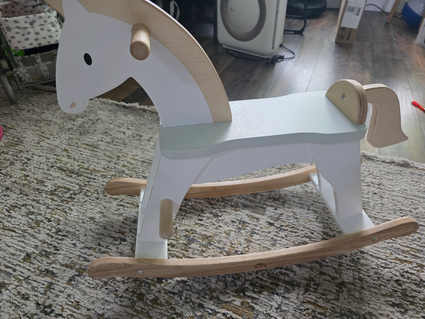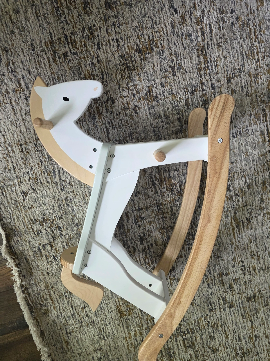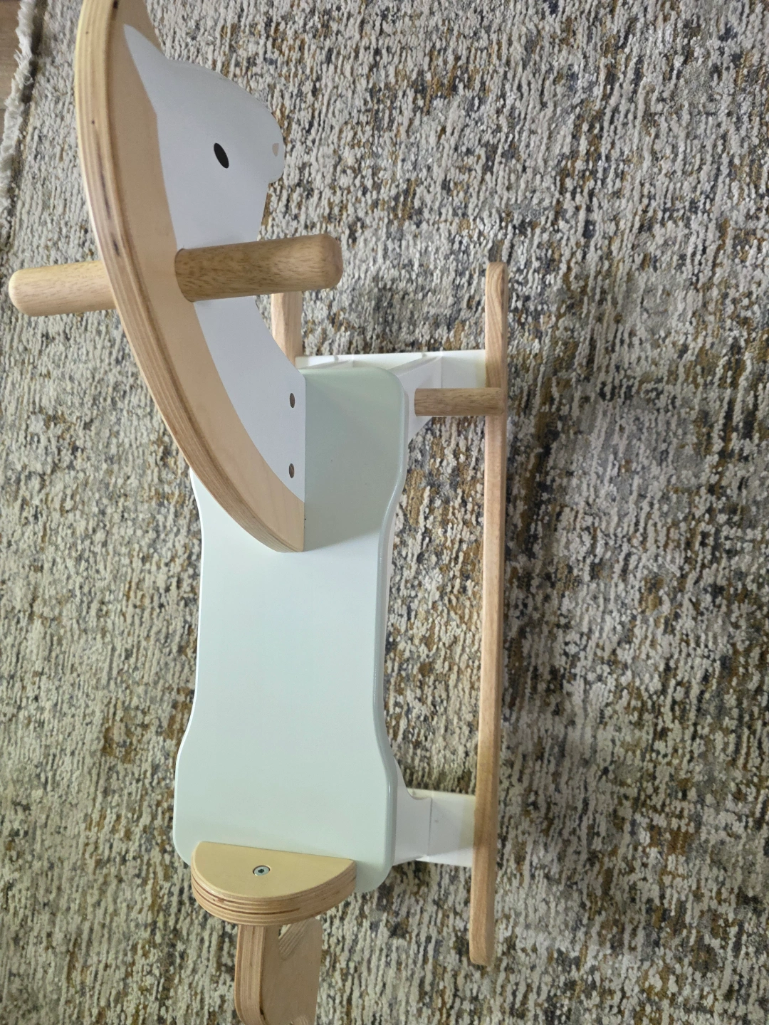 Adorable rocking horse. White and natural wood. Great for toddlers. Gently used. Looks like new.