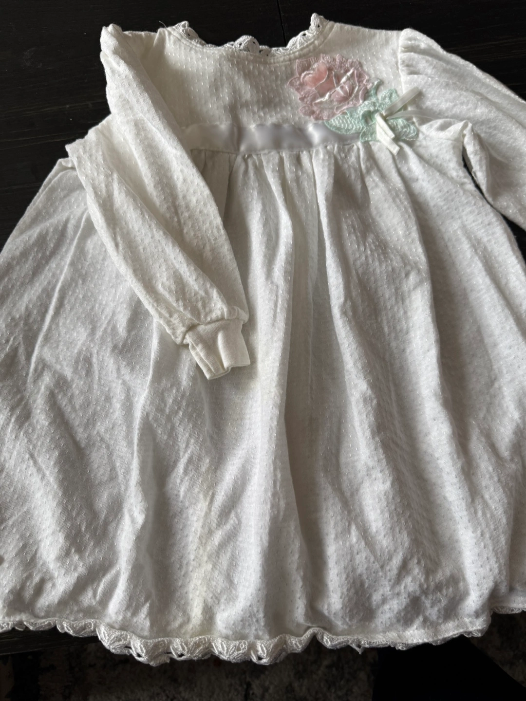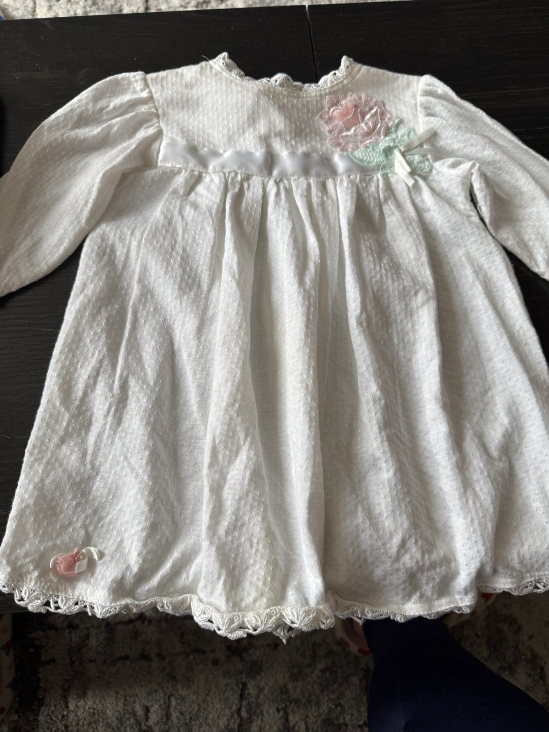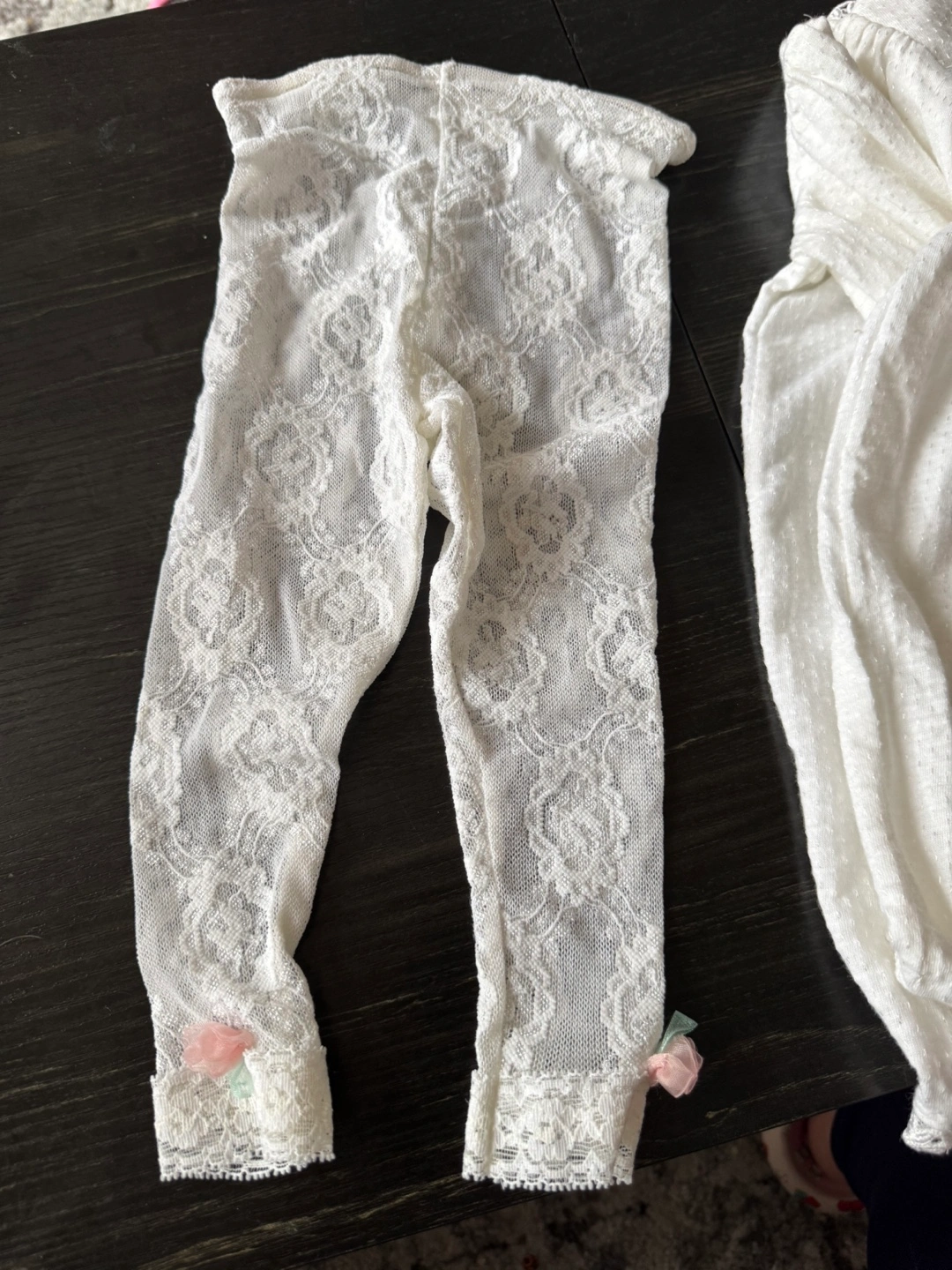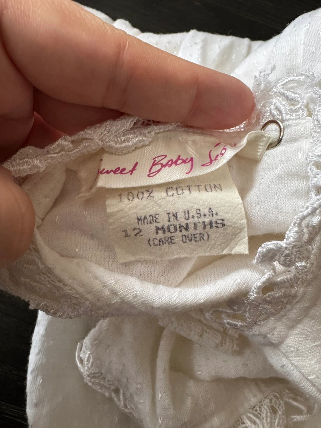 352Adorable baby girl outfit. Includes a white eyelet dress and lace leggings. 100% cotton. Made in the U.S.A. Size 12 months. Paper tag. Buttery soft!
