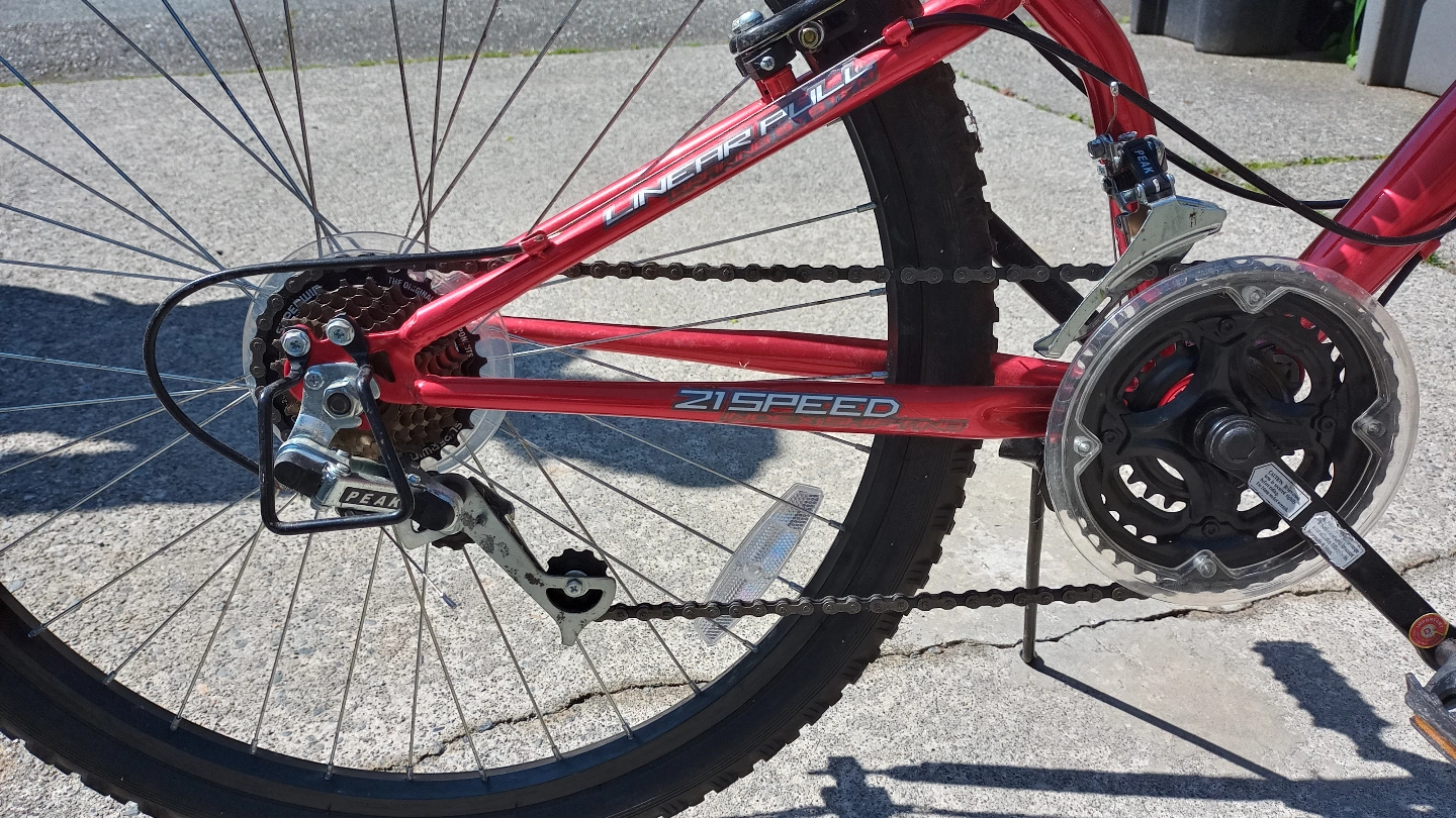 Red 21 speed mountain bike with dual suspension. 26" wheels. Stored in garage and used only once before health issues.
