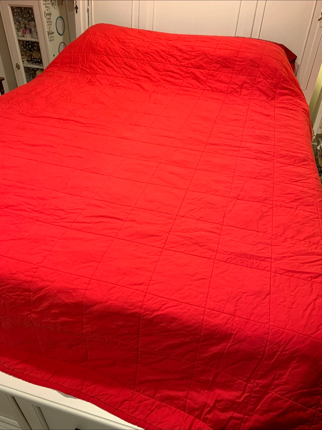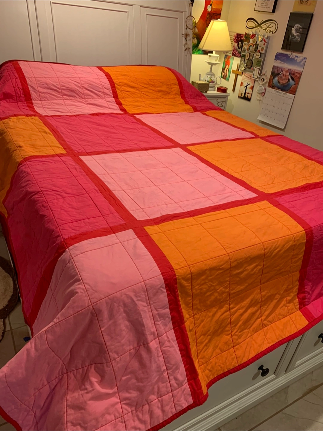 1000+Queen size reversible quilt. One solid red and one patchwork in shades of pink and orange. Soft cotton material. Machine washable. Perfect for a bedroom.