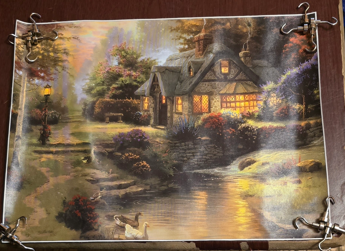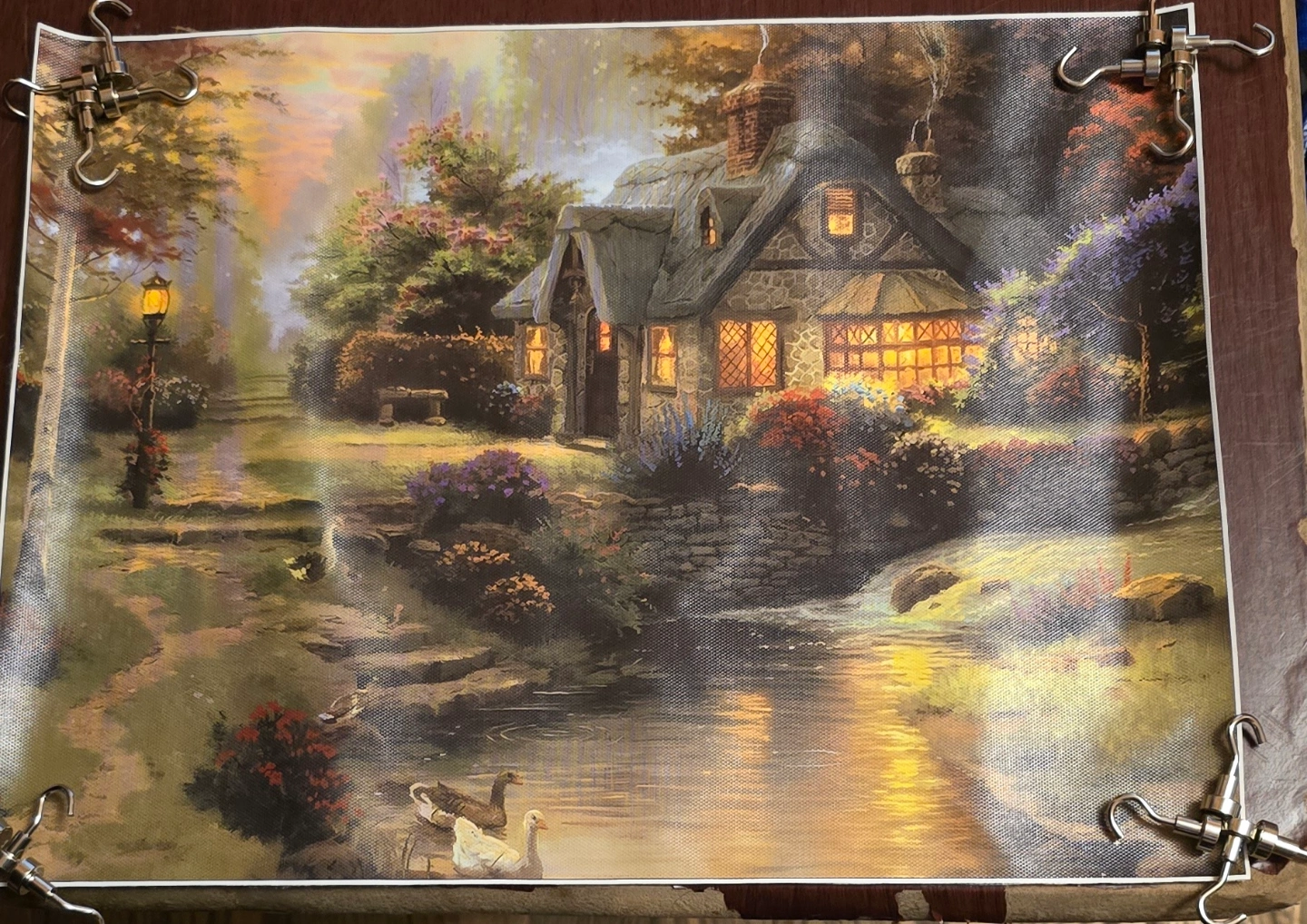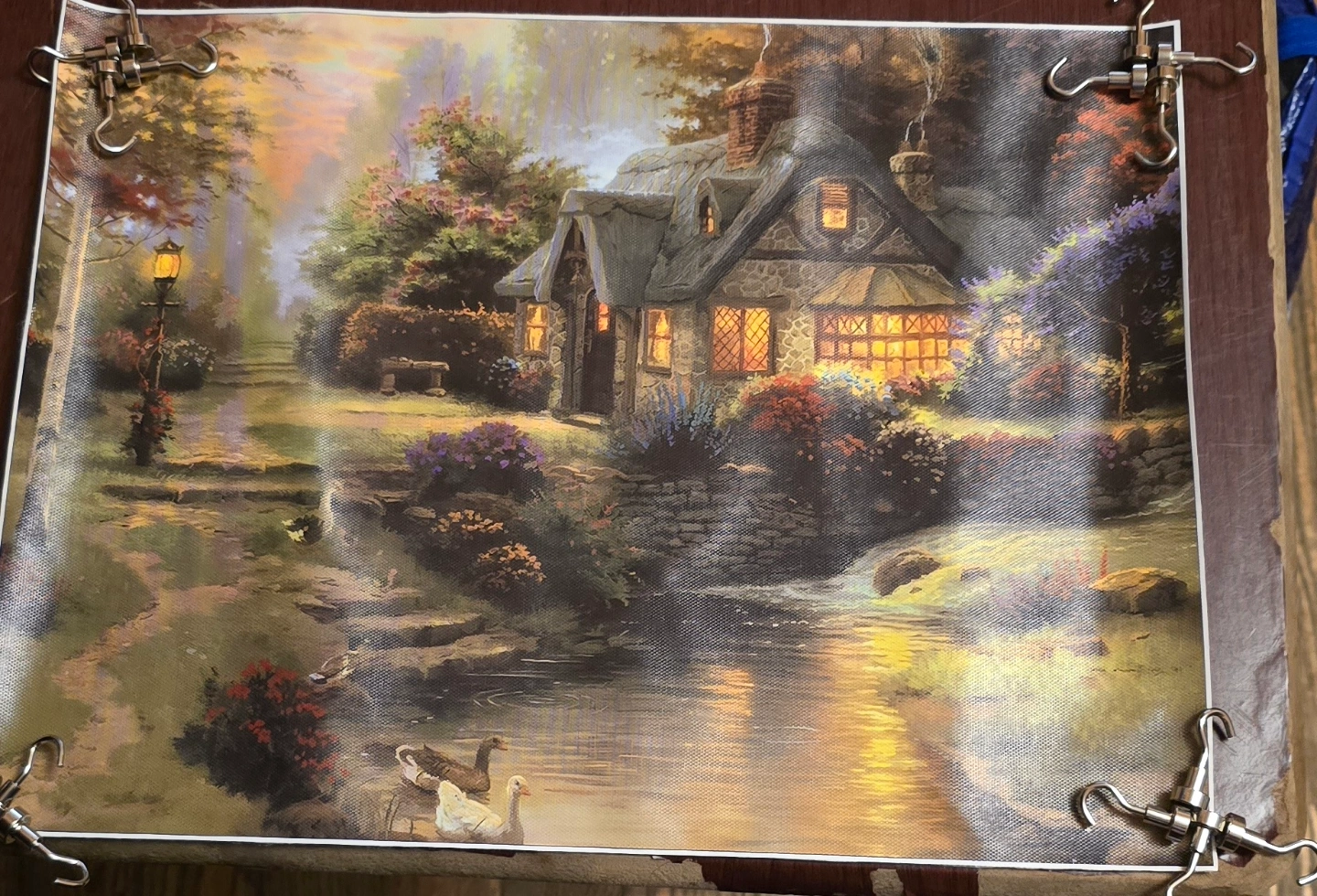 10Lovely landscape painting. Features a cozy cottage by a stream, ducks, and a lamppost. Perfect for home decor. we frame for free.