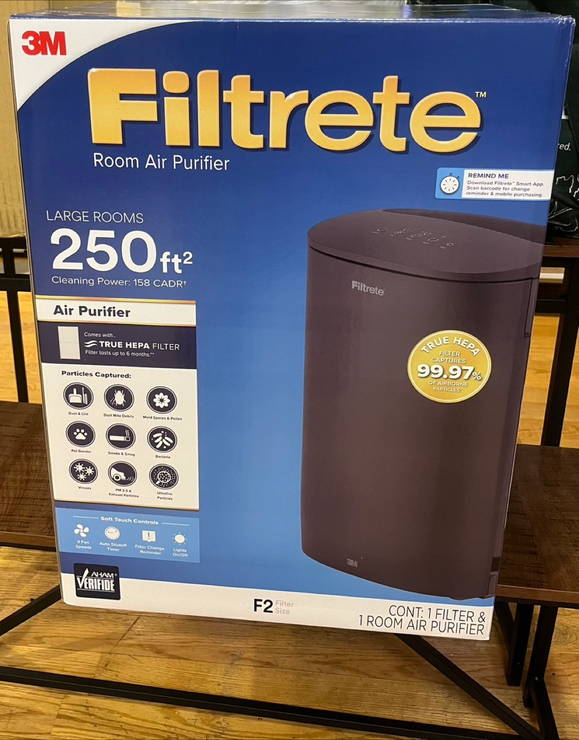 New in box, 3M Filtrete room air purifier. Model F2. Covers 250 sq ft. True HEPA filter. Soft touch controls. Smart Plug compatible. Includes filter.