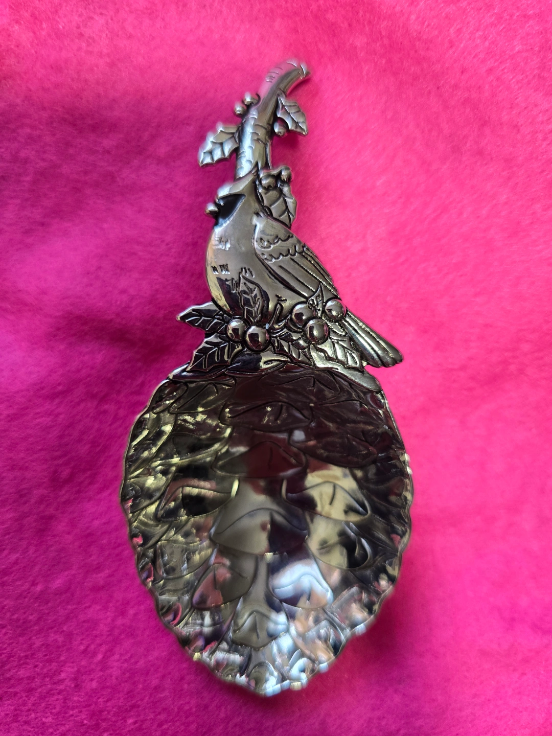 1000+Ornate metal spoon. Features a cardinal perched on a holly branch. Pine cone shaped bowl. Collectible Christmas item.