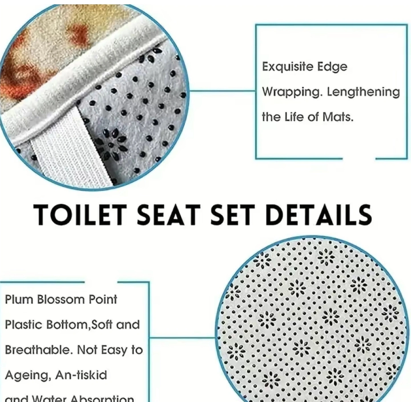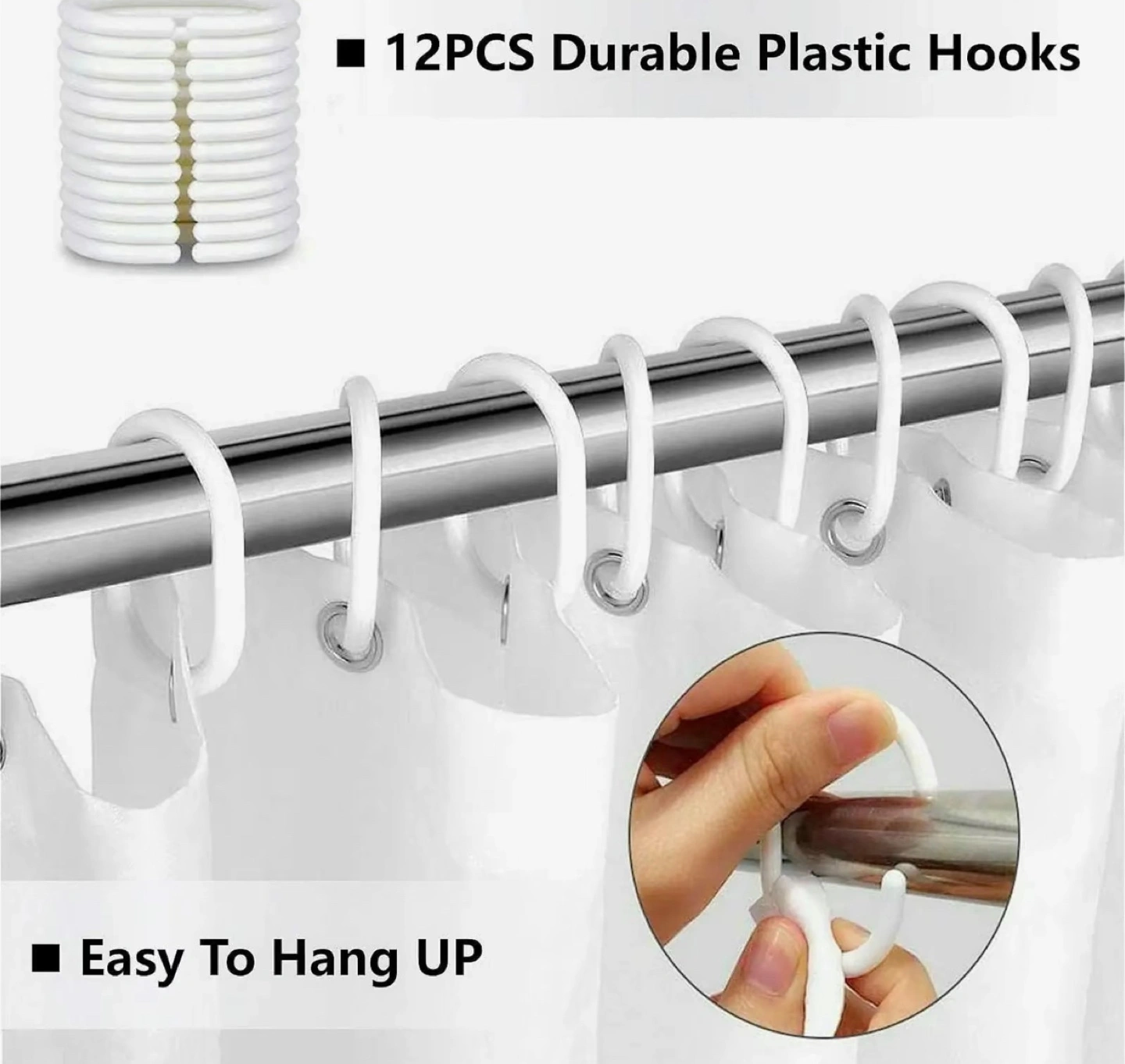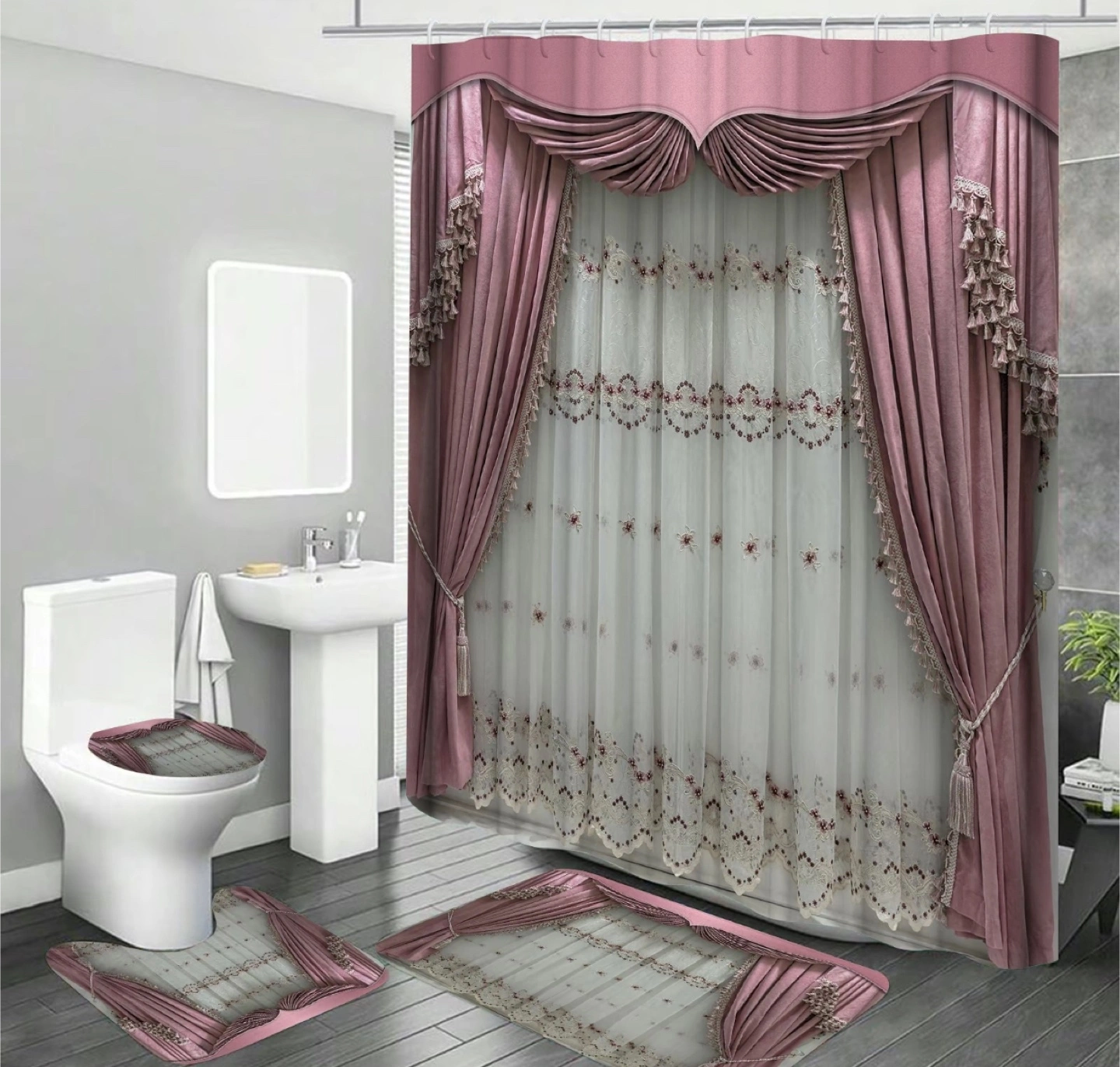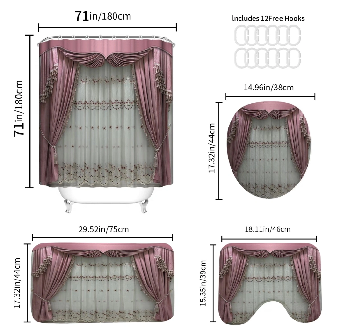 Bathroom curtain set. Includes shower curtain, bath mat, toilet seat cover, and 12 plastic hooks. Features a luxurious pink and white design. Durable plastic hooks included. Soft and breathable materials. Water absorbent.