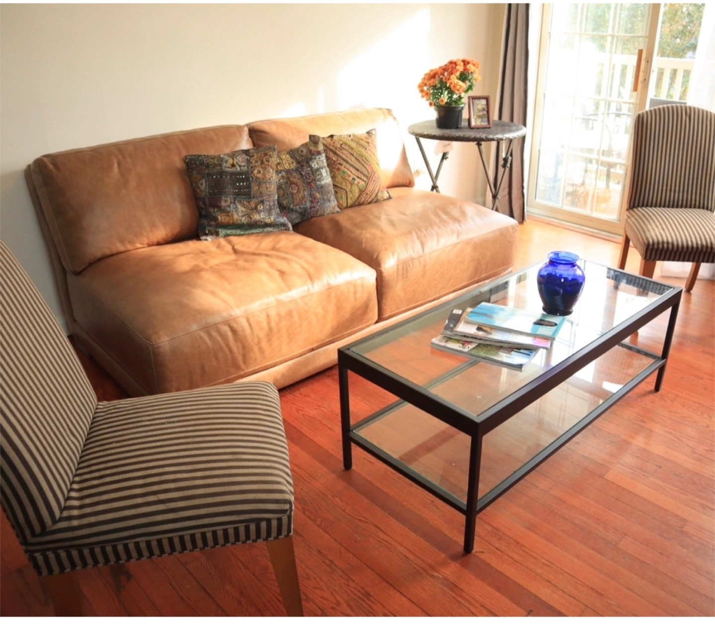 Large, light brown leather sectional sofa. Two cushioned pieces. Good condition. Dimensions: 70 inches wide, 30 inches high, 30 inches deep. Location: Asbury Park, NJ