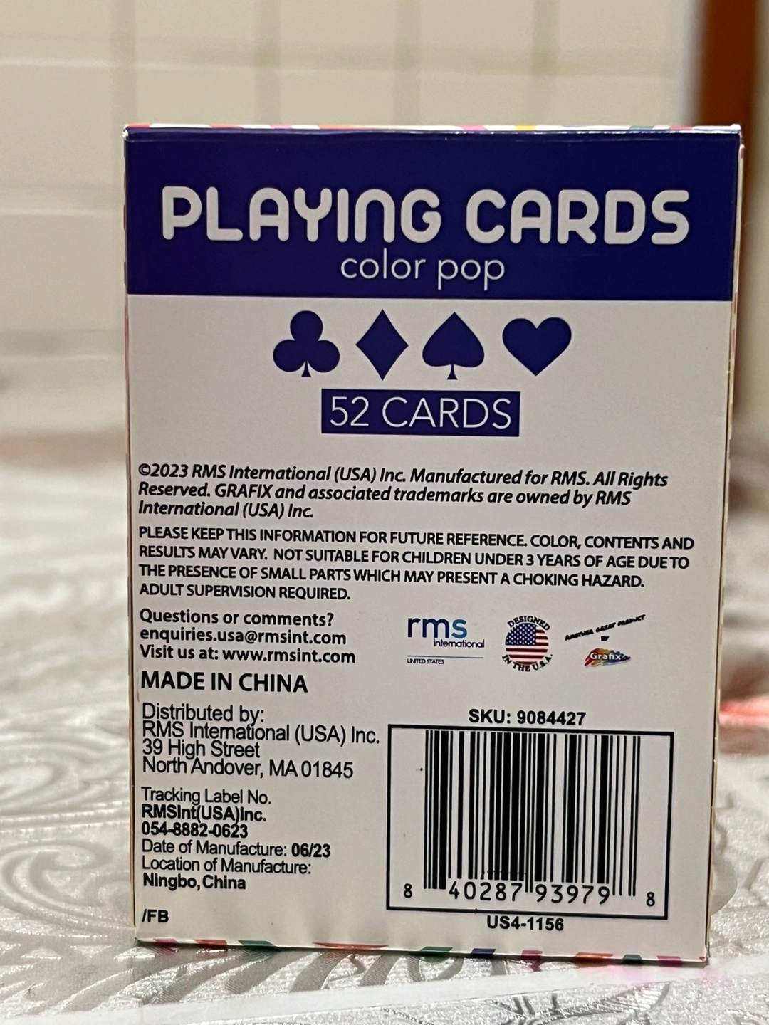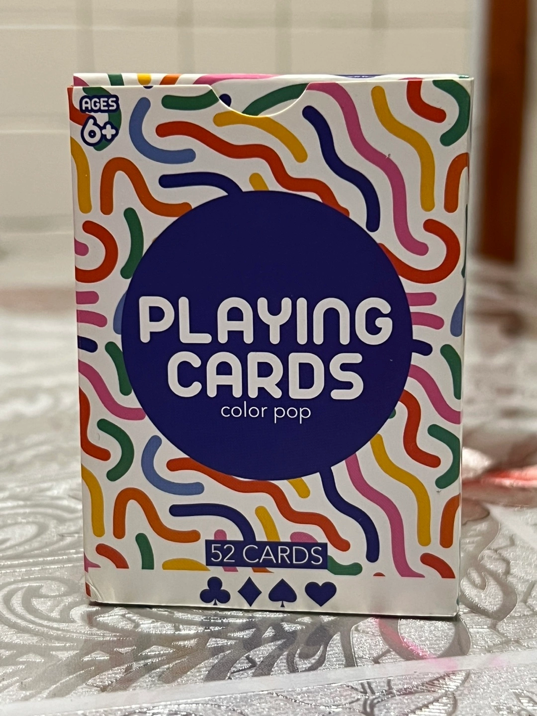 New deck of playing cards. Ages 6+. Colorful design. 52 cards included.