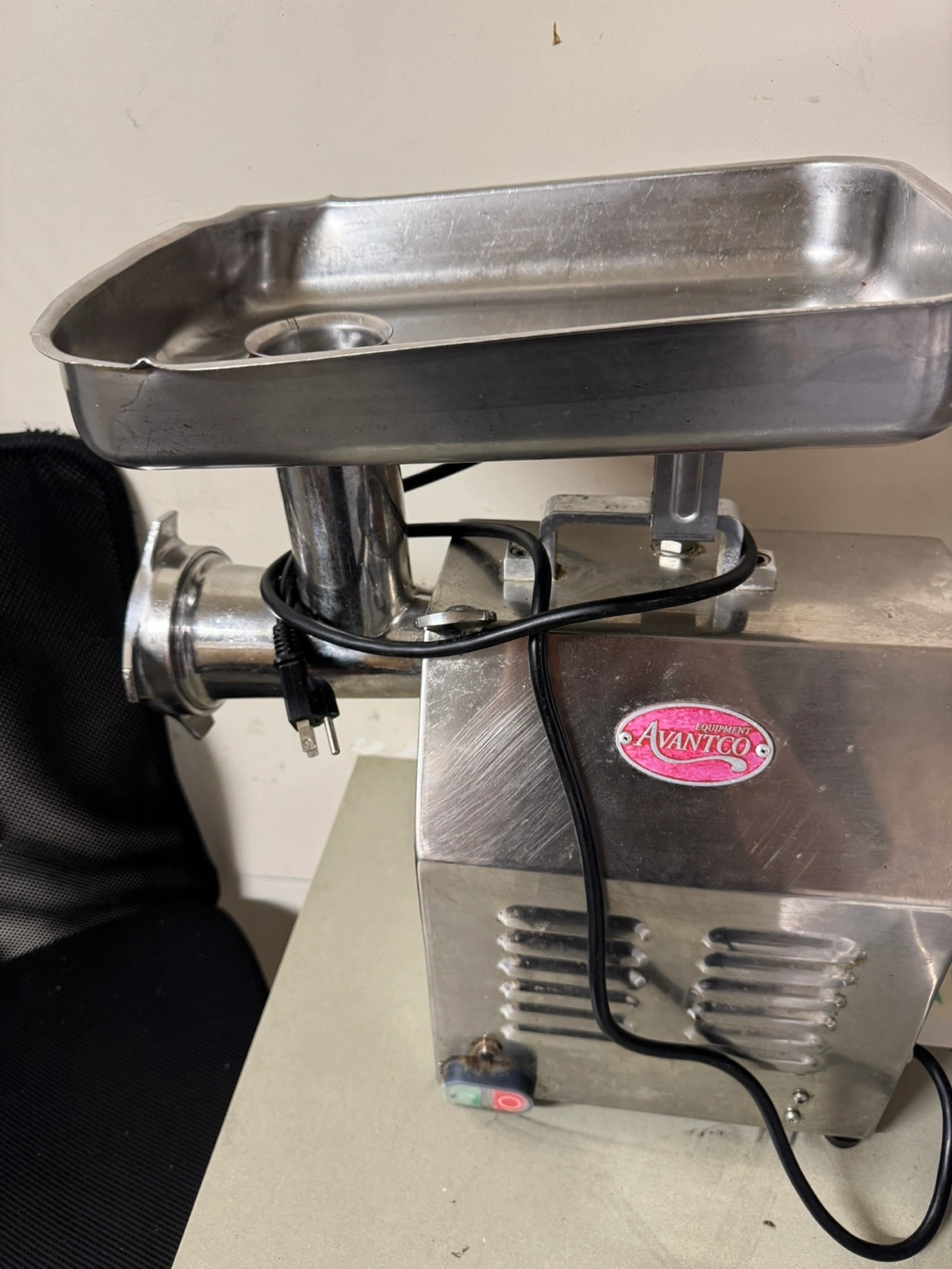 49Stainless steel electric meat grinder. Includes a removable tray. Power cord attached. Used condition.
