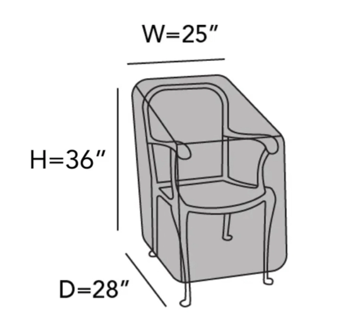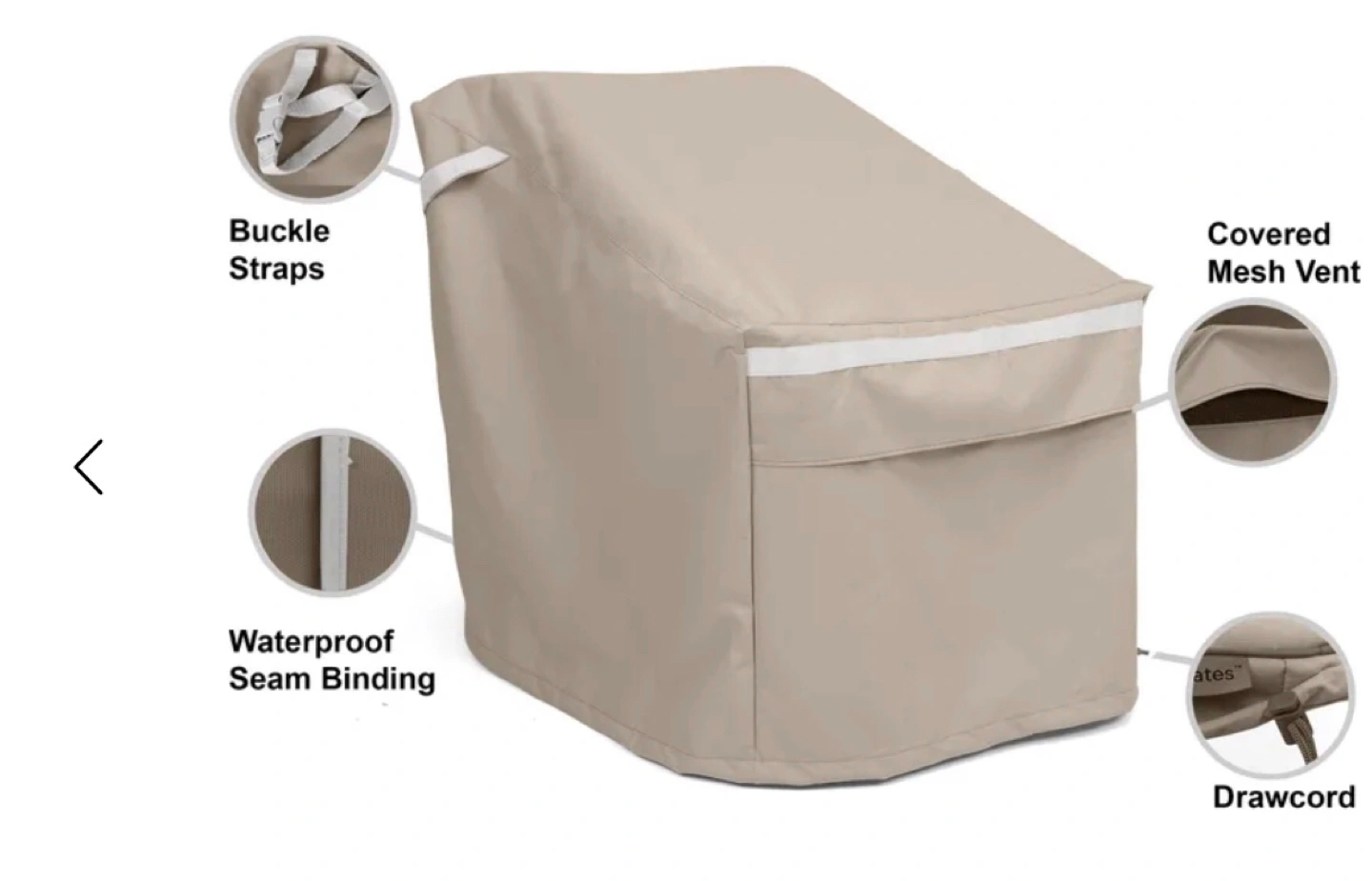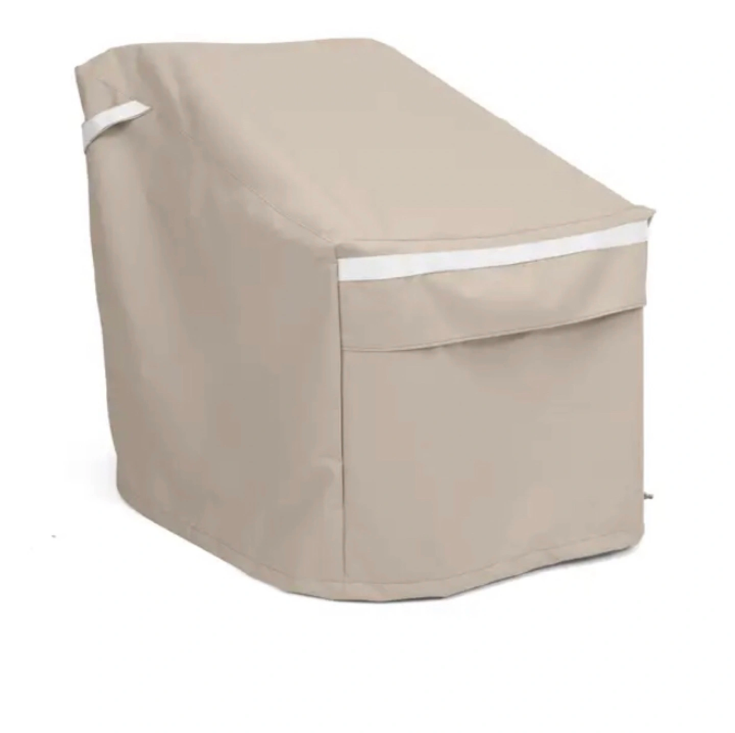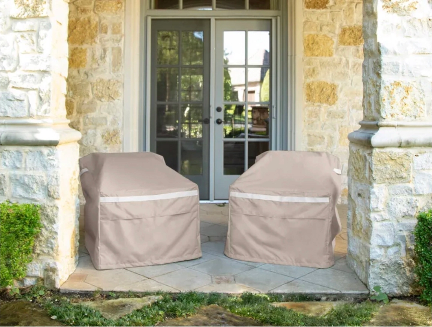 30Set of two beige outdoor patio chair covers. Waterproof seam binding. Buckle straps and drawcord. Mesh vent. Dimensions: 25"W x 36"H x 28"D.