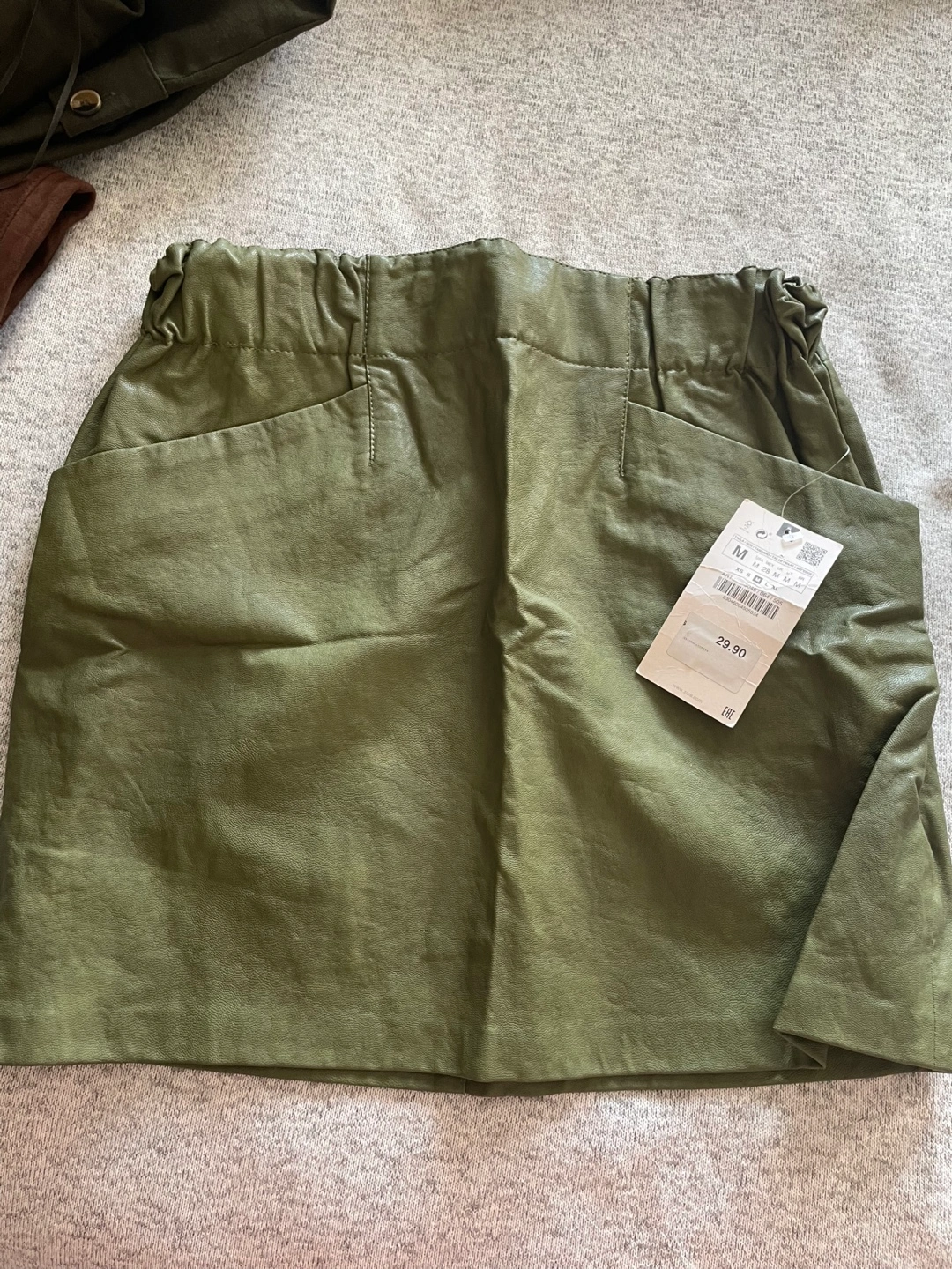 102Olive green faux leather mini skirt. Elastic waistband. Side pockets. Size Medium. Excellent condition.