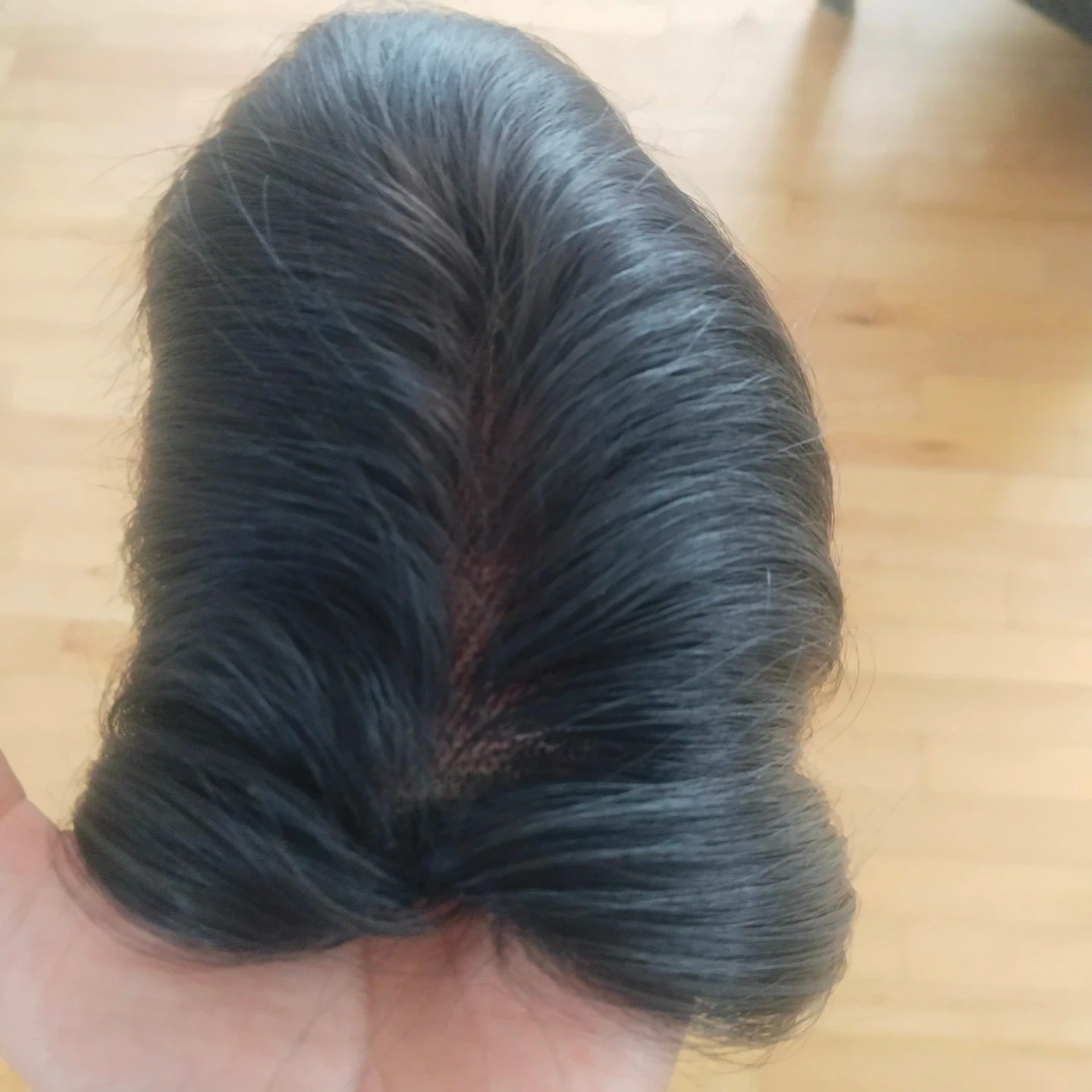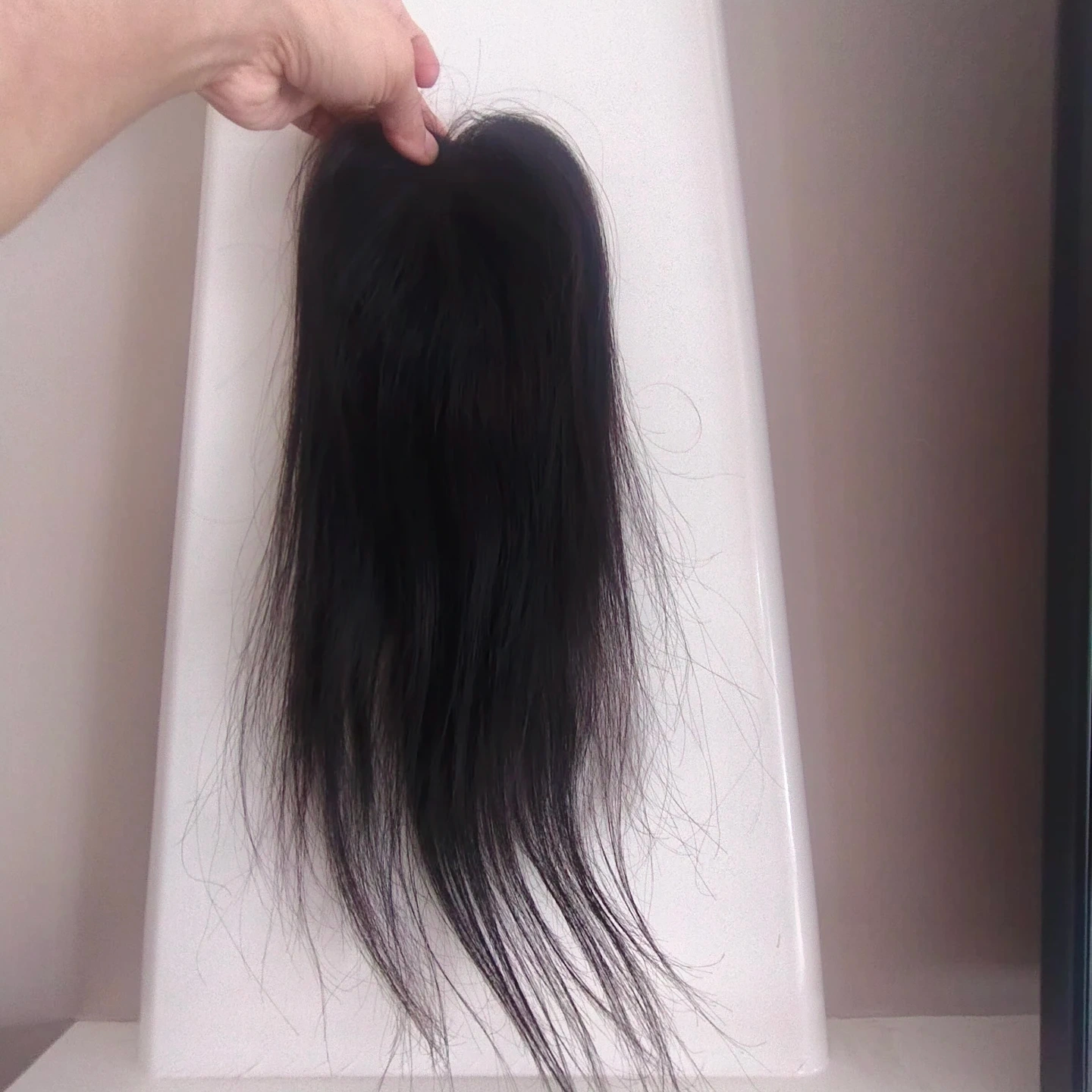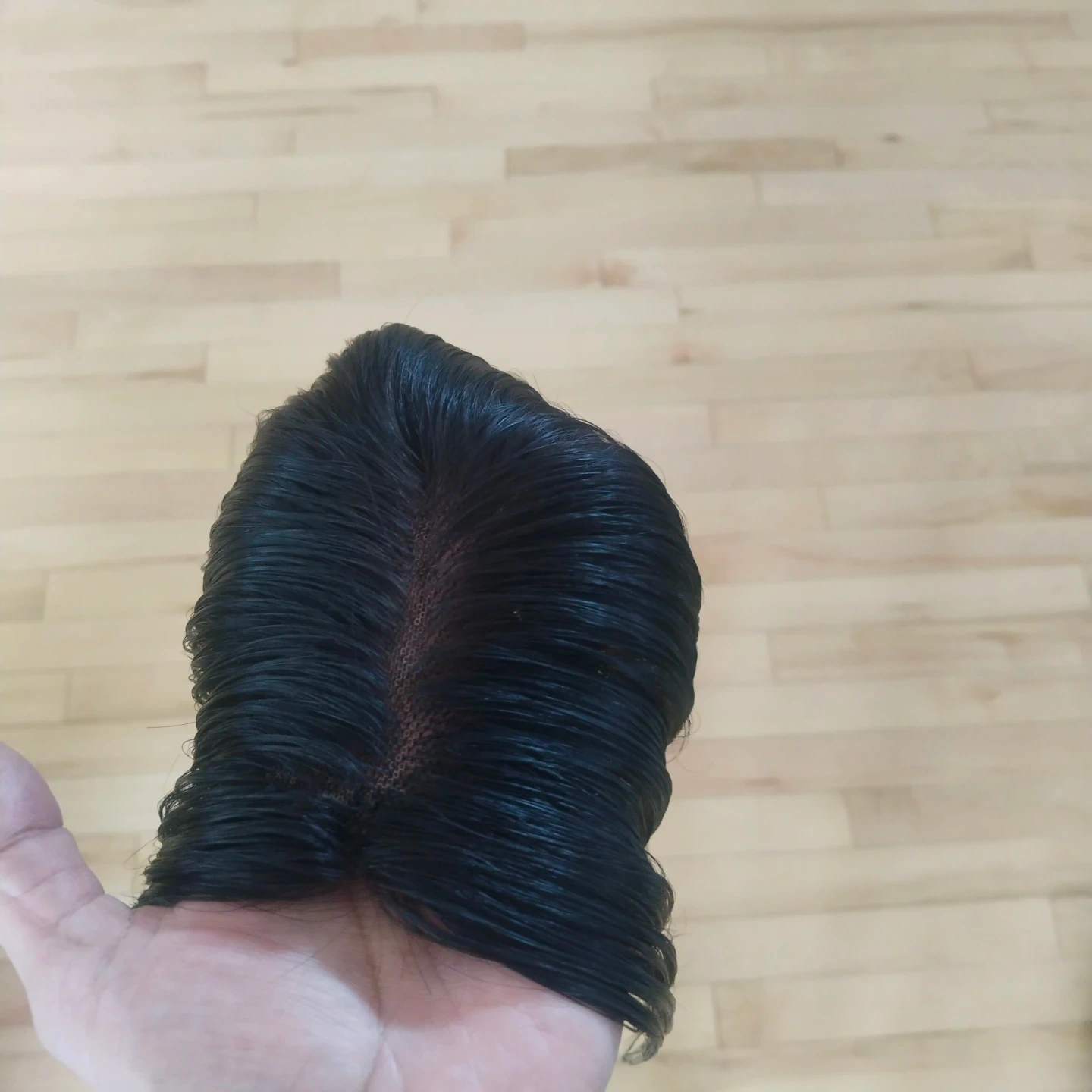 Clip-in hair topper. Natural black colour. Straight hair. Looks relatively unstyled. Suitable for adding volume or covering thinning hair.Women's hair topper, 3*5 extremely light weight lace topper. This Natural Wavy Lace Hair Topper is a 3” by 5” 16 inch soft transparent skin color lace based extension. It is expertly hand tied hair piece made of Remy pure human hair. The topper when worn at the hair line covers the entire crown and hairline giving a flawless natural look. It is light weight and clips in quickly and easily for all-day comfort.