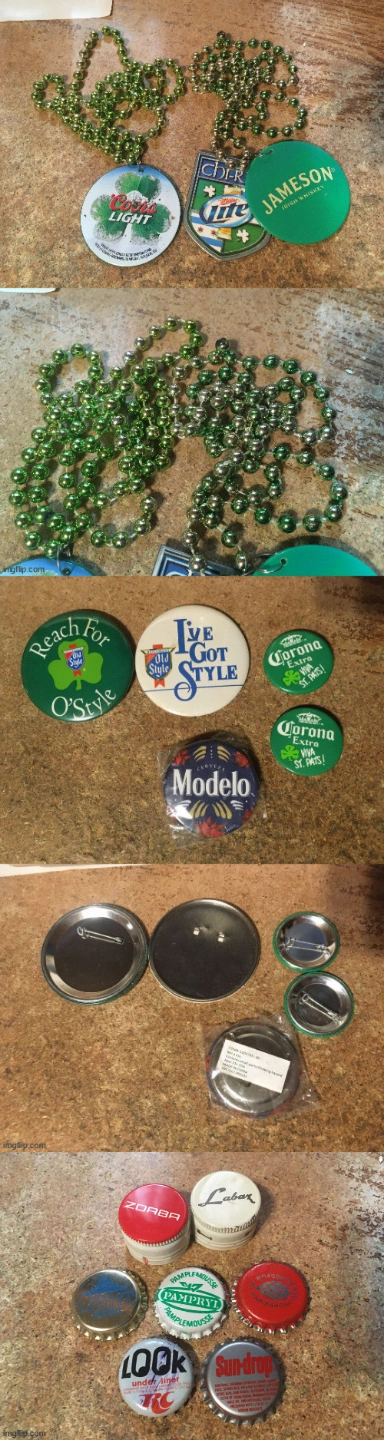 Collection of beer-themed items. Includes various glasses, bottle caps, Mardi Gras beads, posters, and buttons. Several brands represented. last picture for details on all the items pick up at house