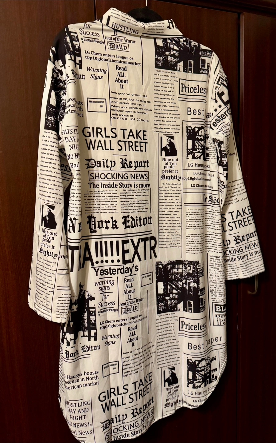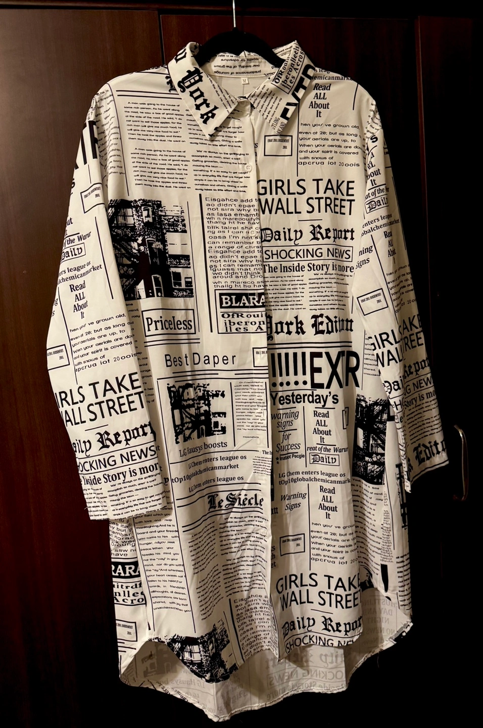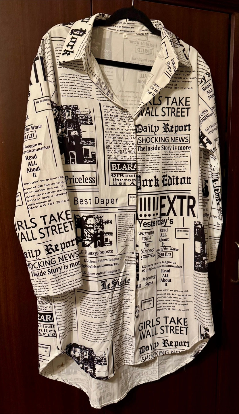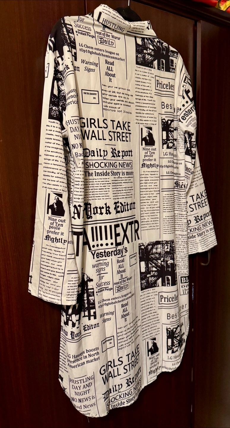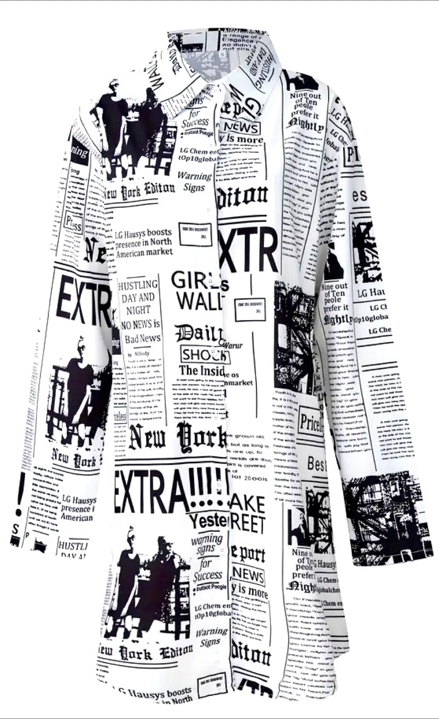 Long sleeve collared shirt/dress. Black and white newspaper print. Relaxed fit. Lightweight material. Casual style.