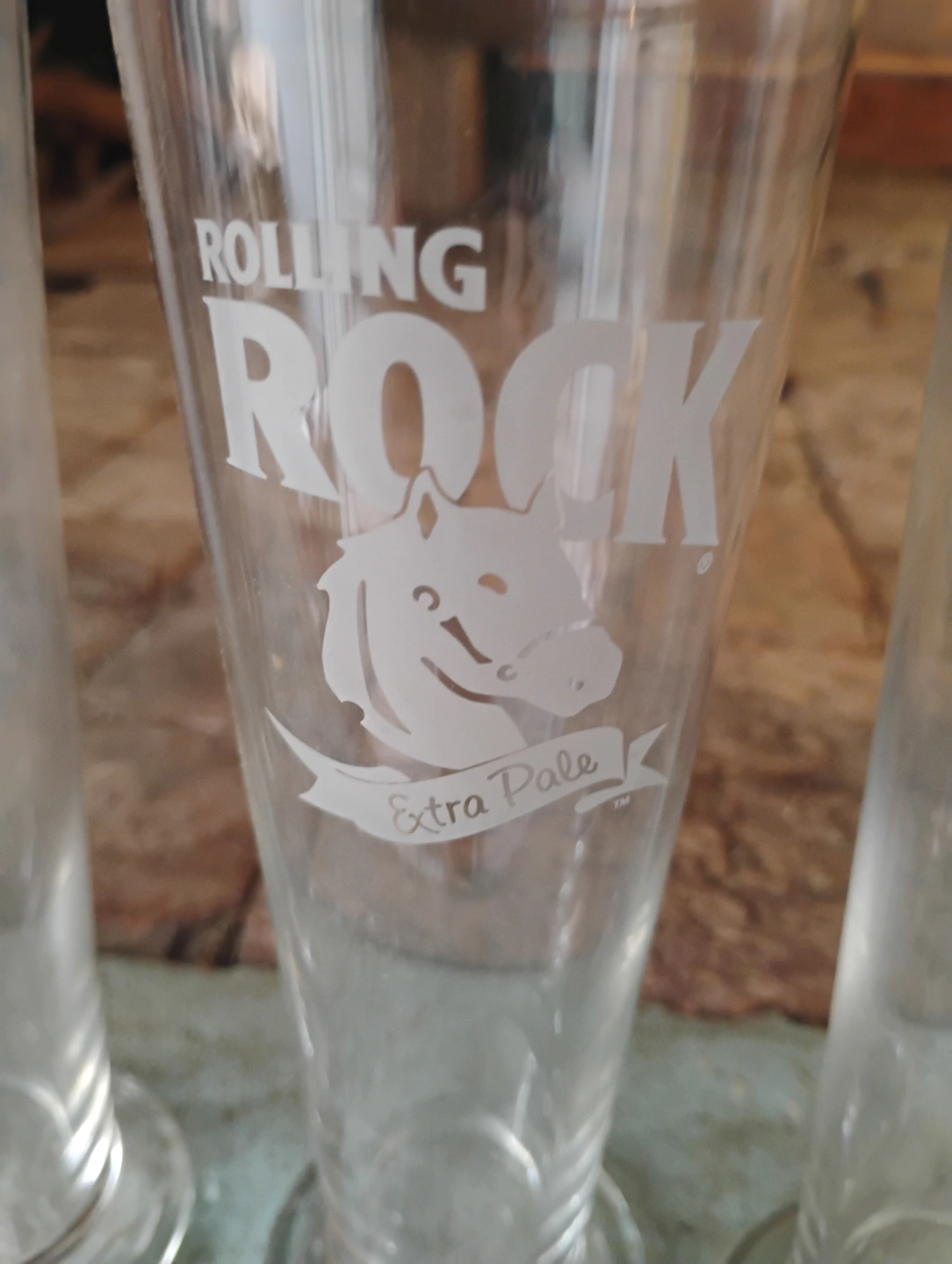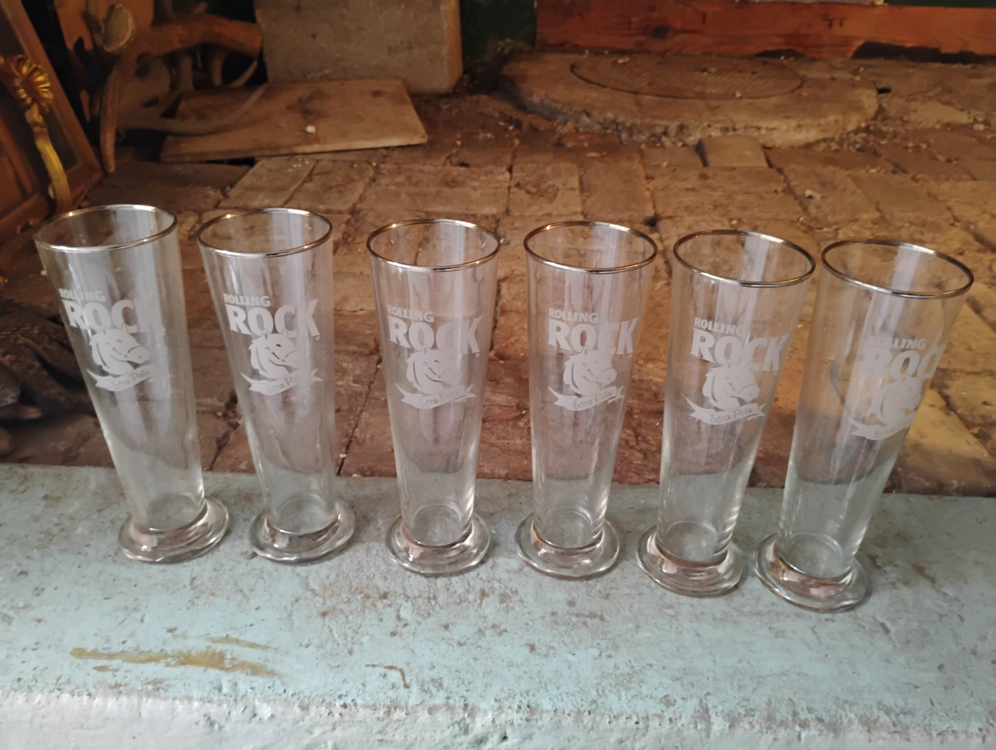 Set of six tall Rolling Rock Extra Pale beer glasses. Etched logo. Silver rims.
