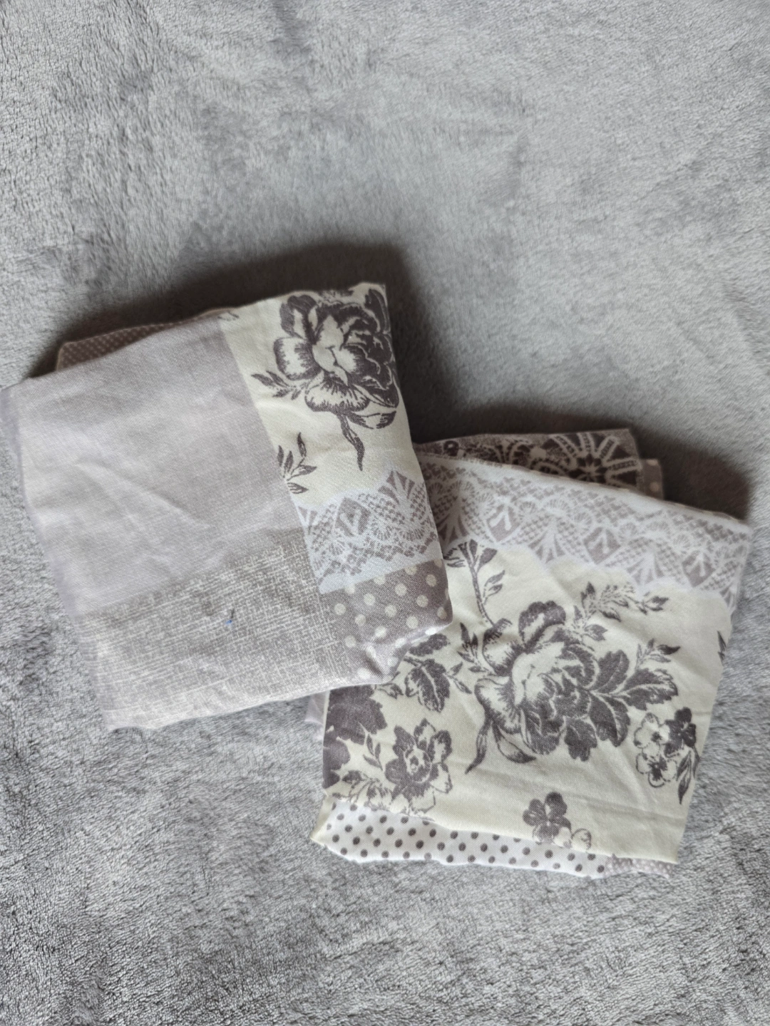 1000+gentle use Set of two pillowcases. Beige and grey patchwork design. Features floral and lace patterns. Soft fabric. Standard size. #freecycle