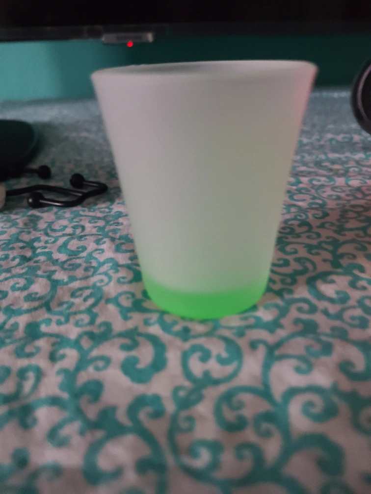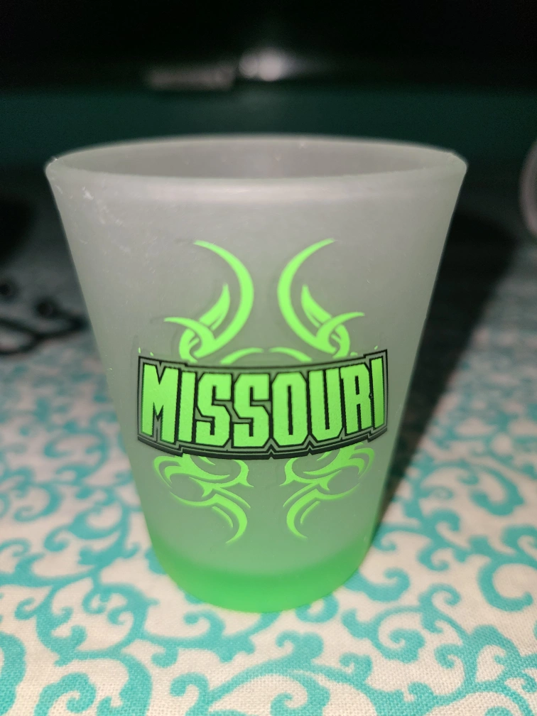 Am giving you another shot of this Frosted shot glass life. Features a green tribal design and the word Missouri. Neon green bottom. You will be asked to verify that you are here when picking up. #freecycle