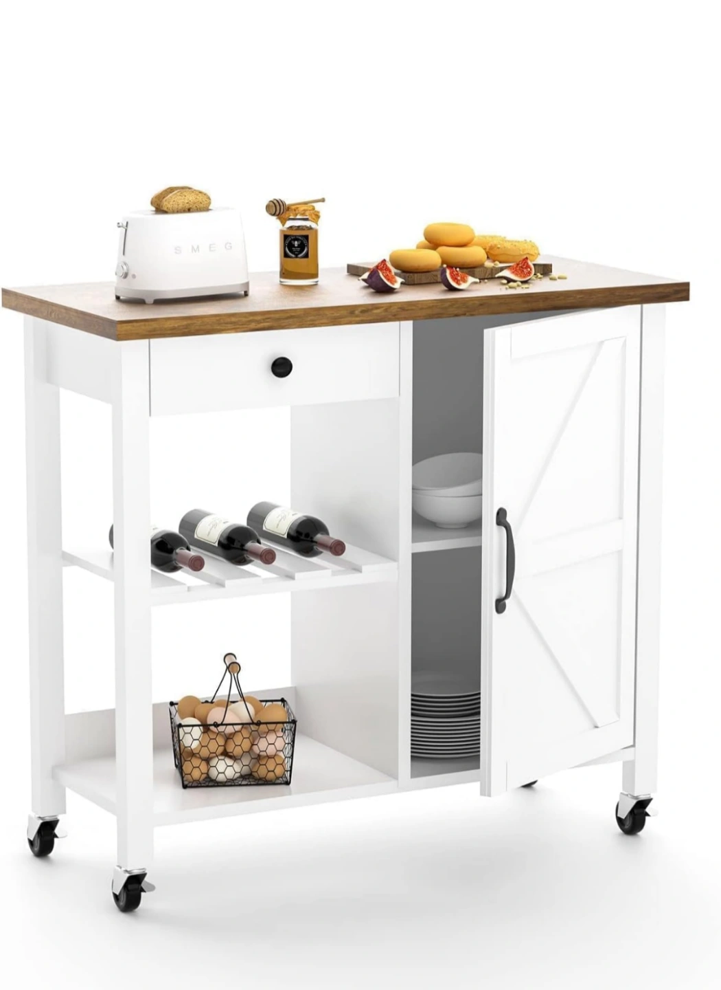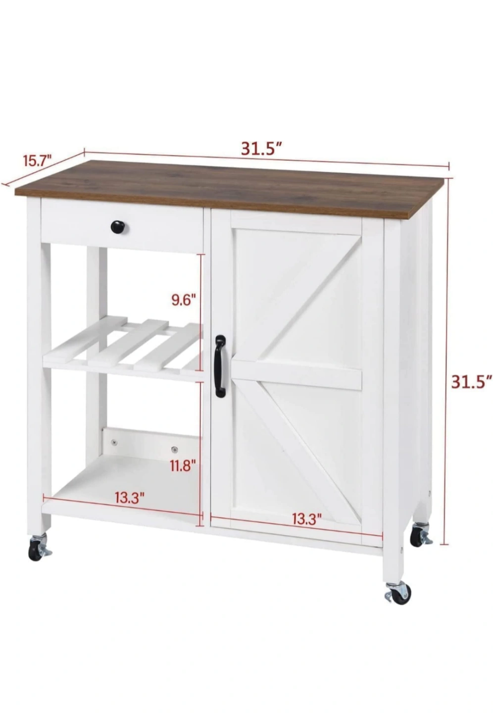 232White kitchen island cart. Brown wood top. Features drawer, cabinet with door, and open shelving. Rolling casters for mobility. Great for extra counter space and storage. minor wear on front edge.