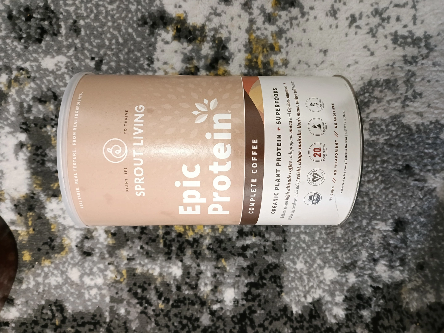Plant-based protein powder. Organic plant coffee. Superfoods blend. 20 grams of protein per serving. Best by February 6, 2026.