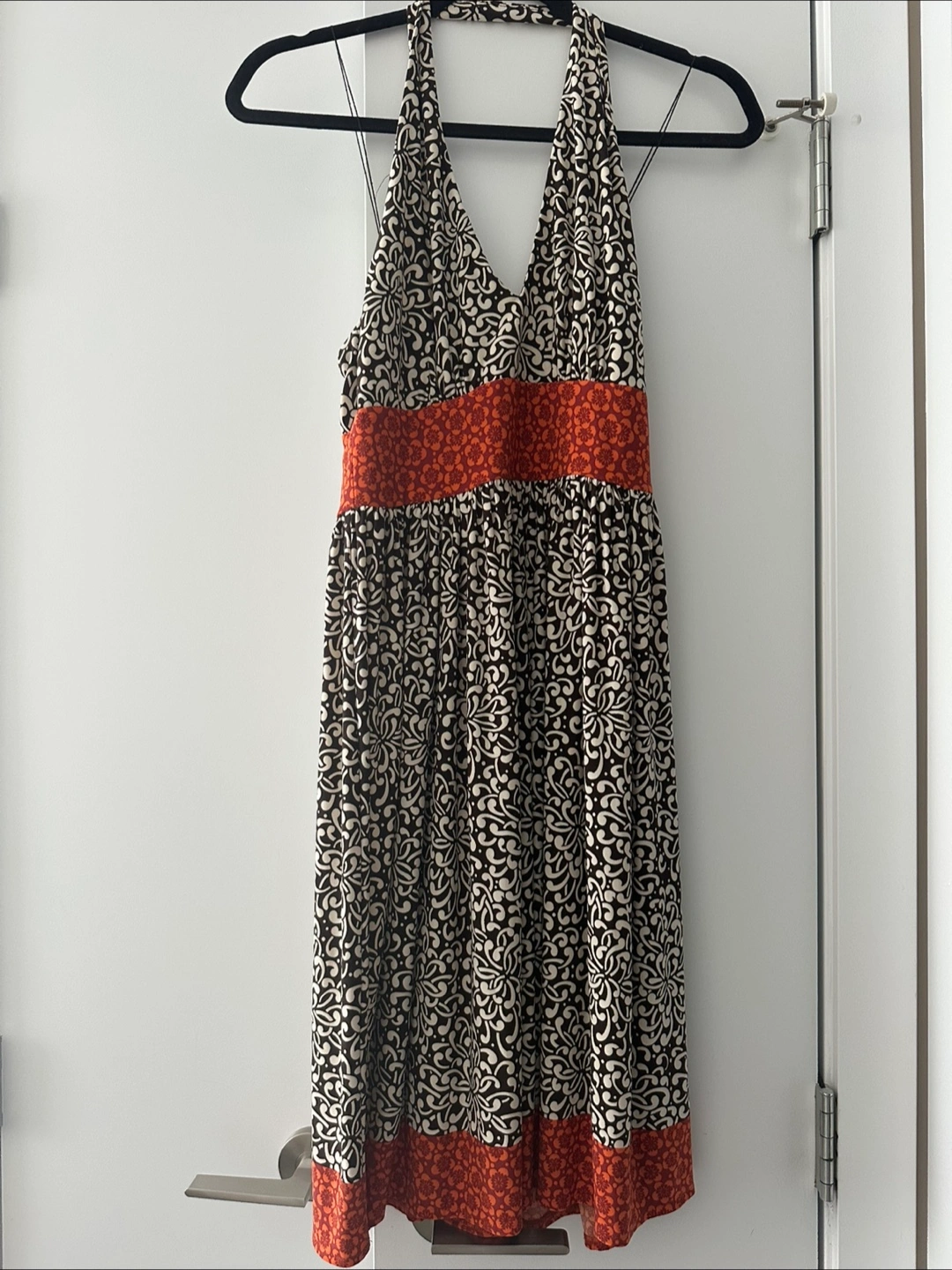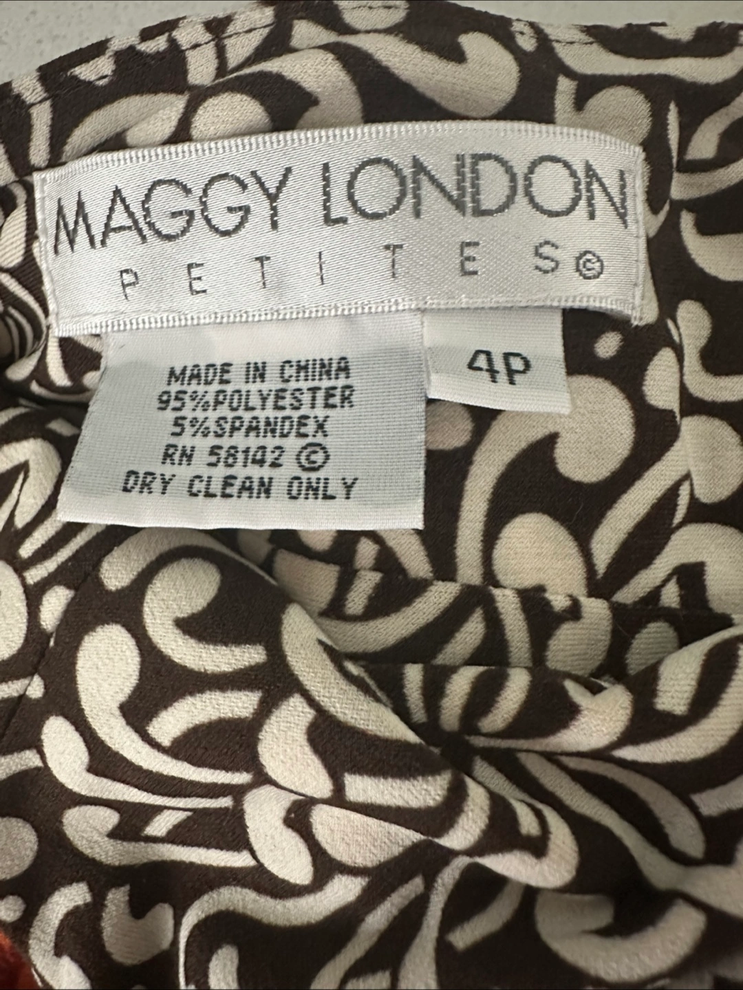 Brown and cream floral print. Orange accents at the waist and hem. Size 4P.