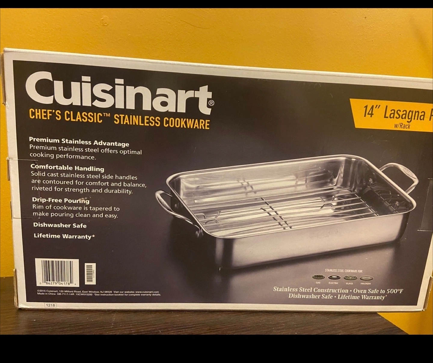 1000+Stainless steel lasagna pan. Includes rack. Oven safe to 500Β°F. Dishwasher safe. Lifetime warranty.