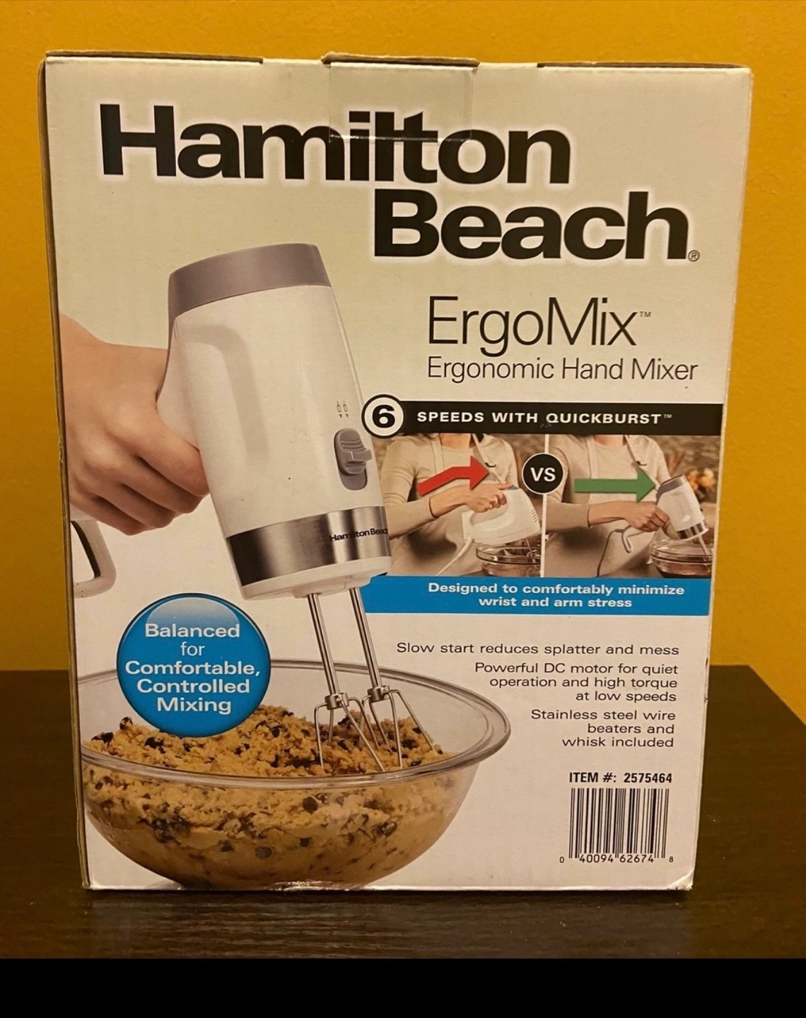 1000+Ergonomic hand mixer. Six speeds with Quickburst. Stainless steel beaters and whisk included. Designed for comfortable, controlled mixing. Minimizes wrist and arm stress.