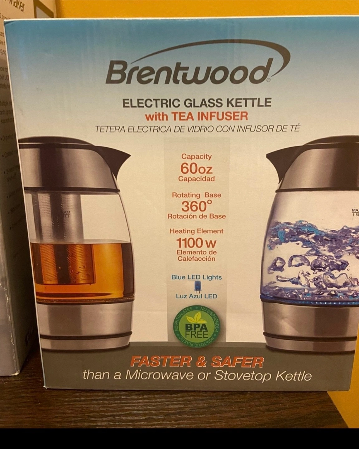 1000+Glass electric kettle. 60oz capacity. 360° rotating base. 1100w heating element. Blue LED lights. BPA free.