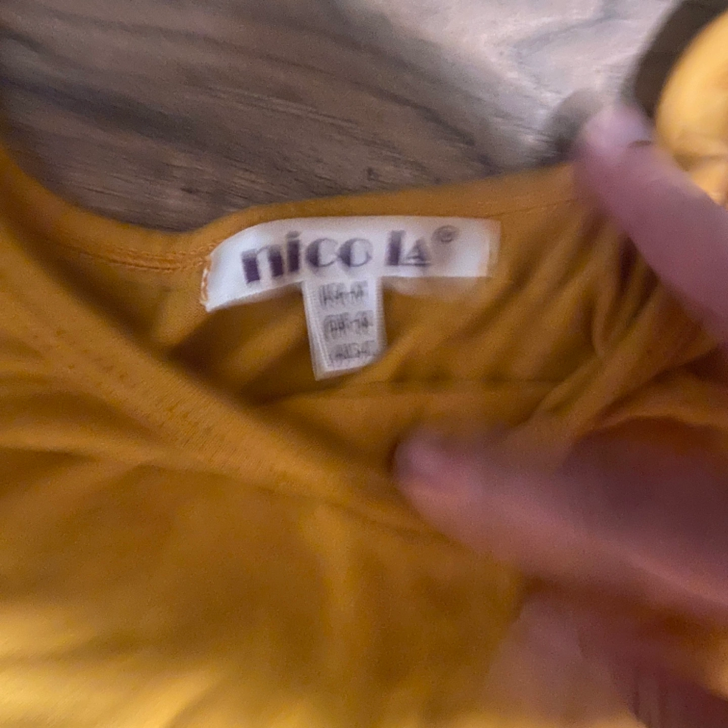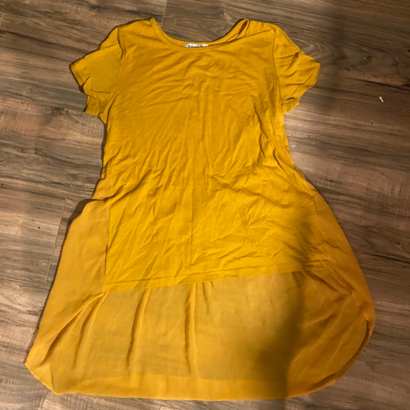 Mustard yellow high-low shirt. Short sleeves. Sheer bottom. Size M.