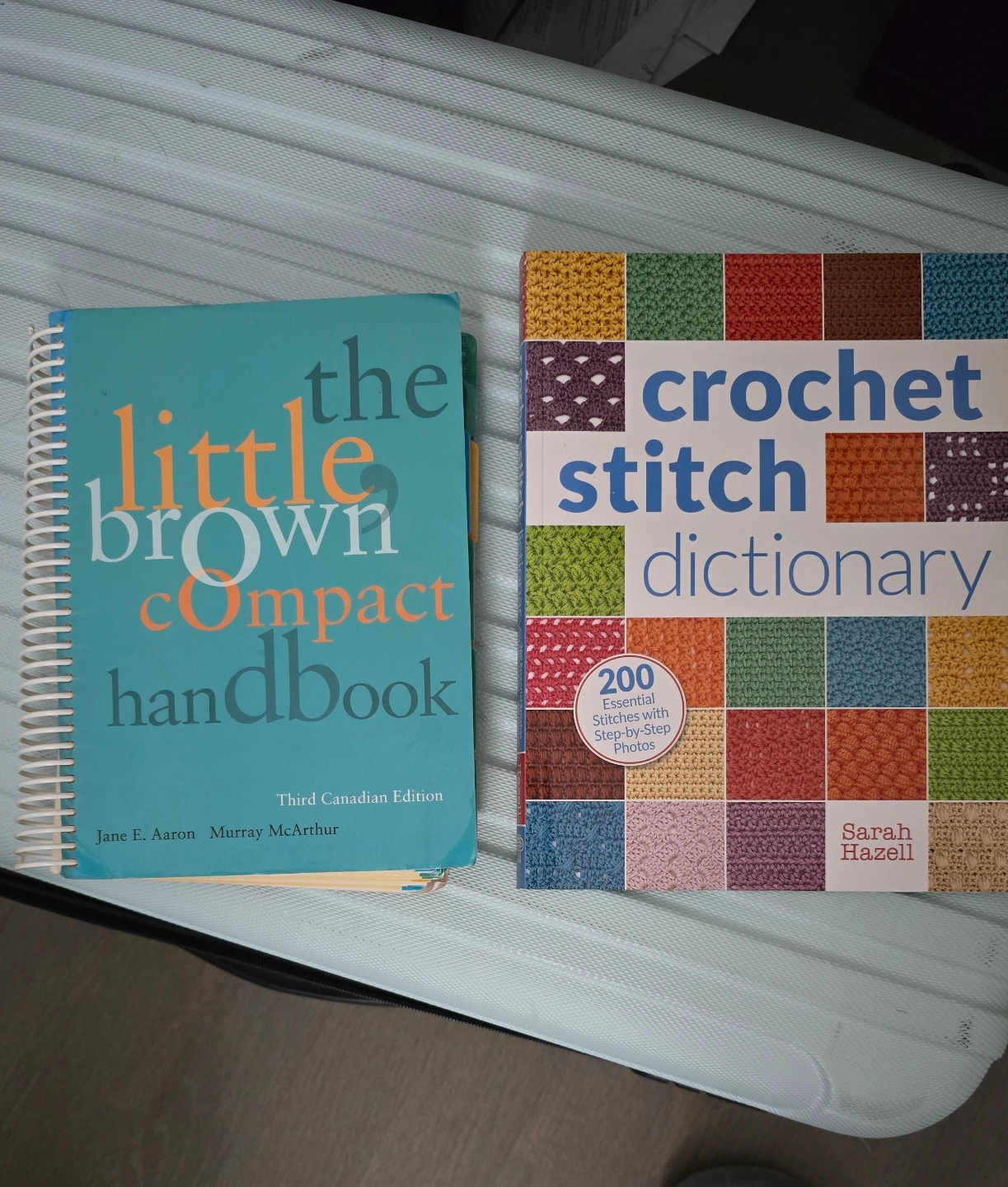 Two used craft books. The Little Brown Compact Handbook, third Canadian edition by Jane E. Aaron and Murray McArthur. Crochet Stitch Dictionary by Sarah Hazell, features 200 essential stitches with step-by-step photos.
