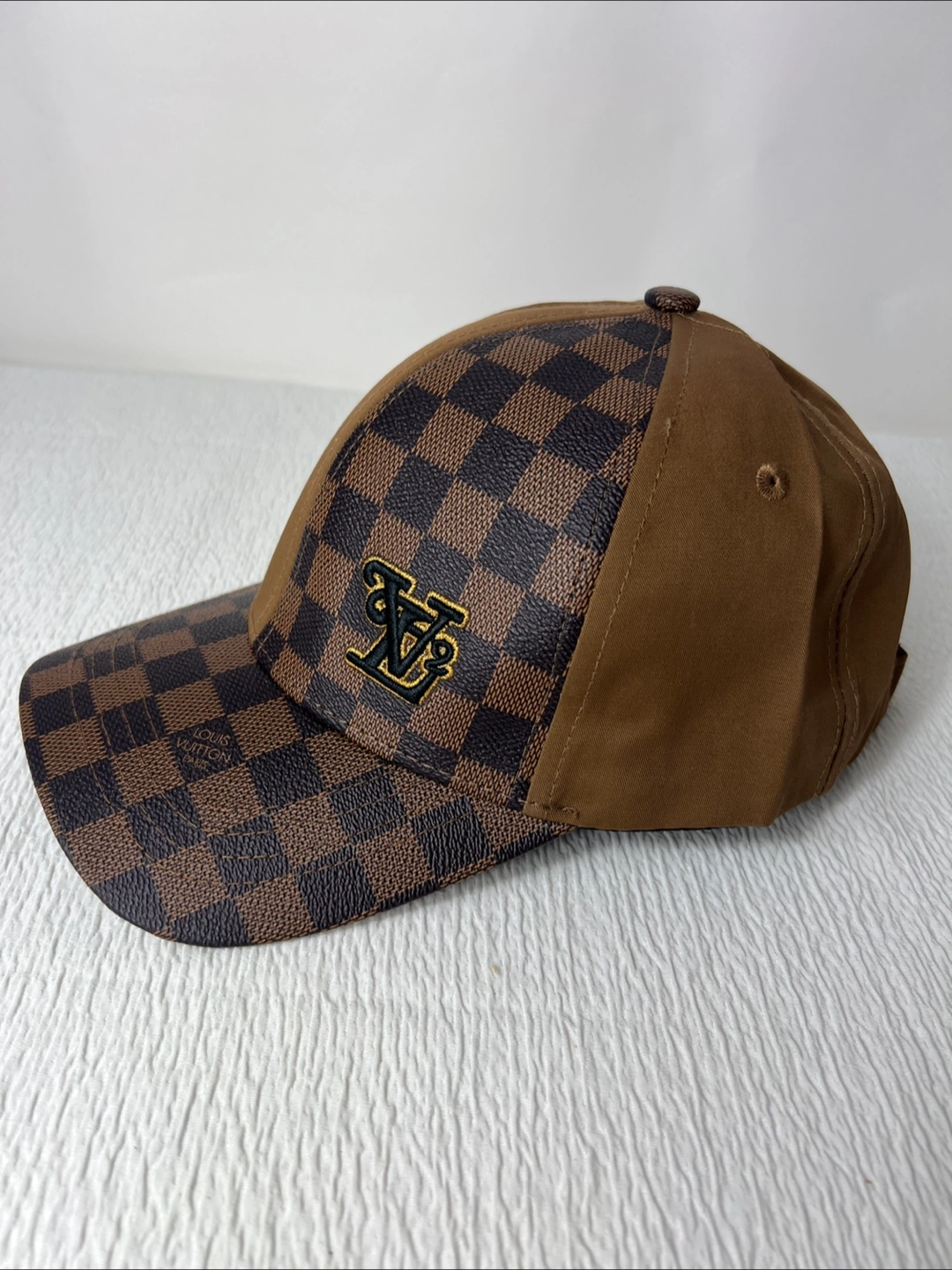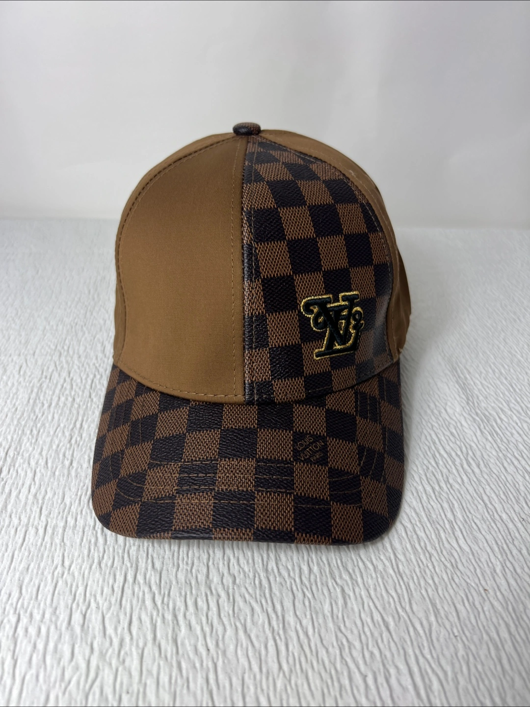 Brown and black checkered pattern. Brown back. Embroidered logo. Adjustable.
