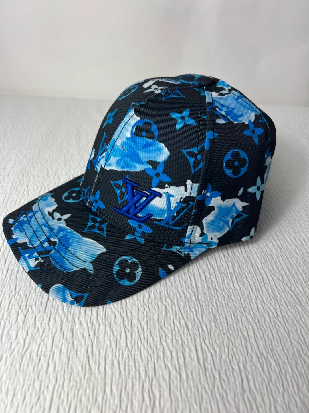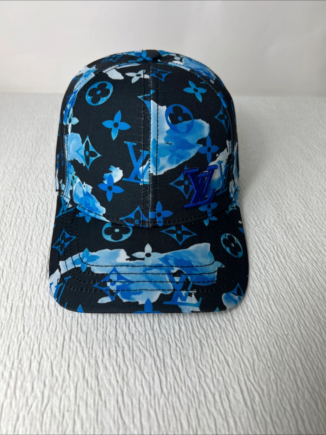 Classic baseball cap. Black base with blue watercolor monogram. Adjustable back strap. Excellent condition.