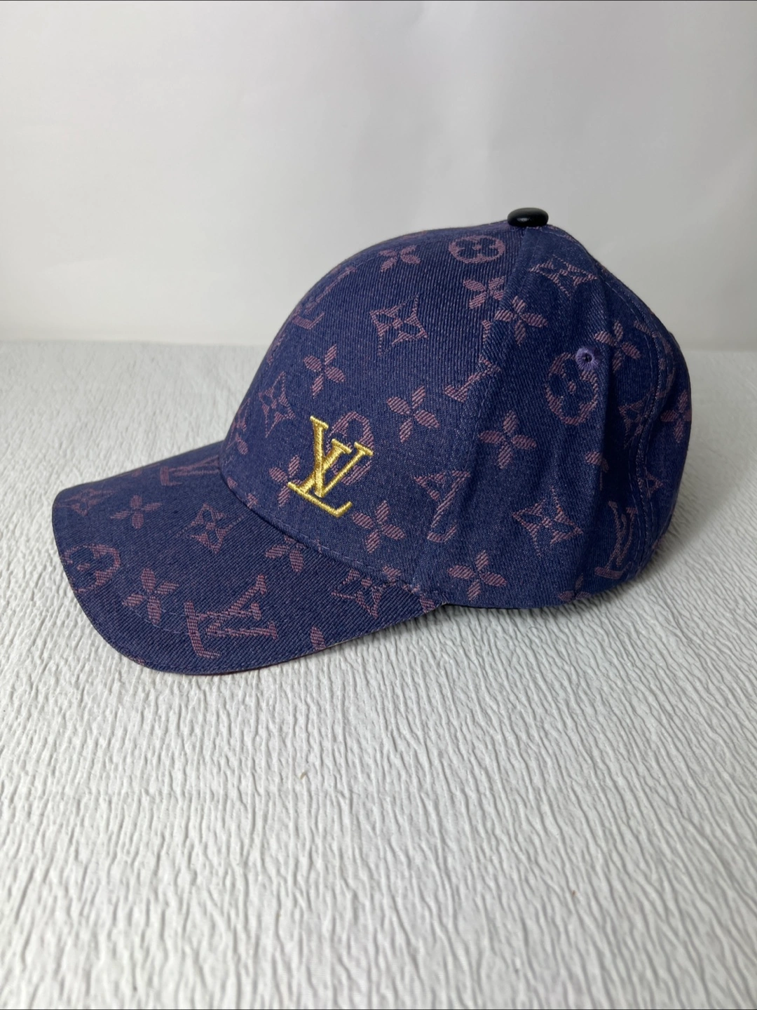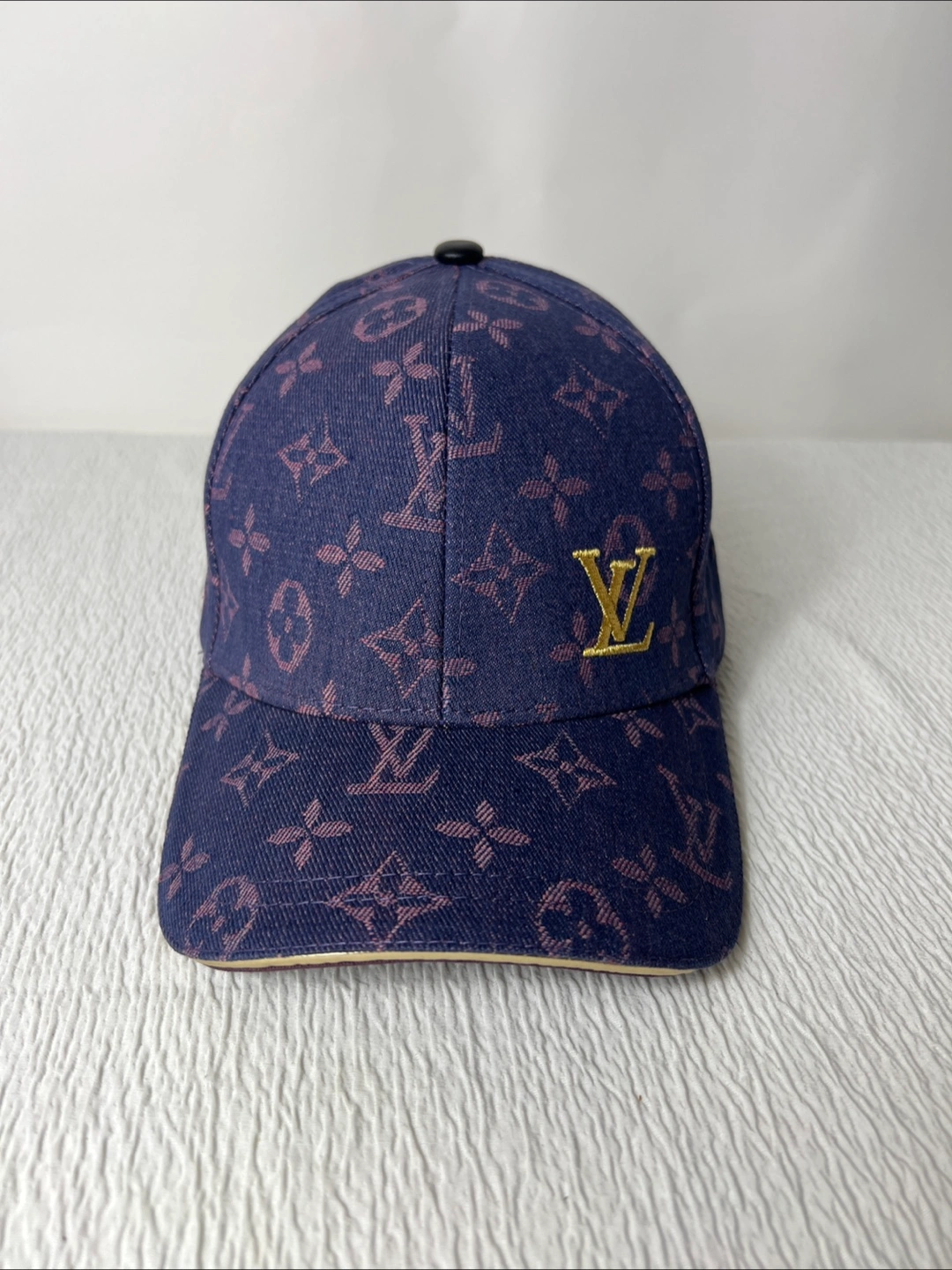 105Dark blue baseball cap. Features the iconic Louis Vuitton monogram pattern. Gold LV logo. Adjustable back.