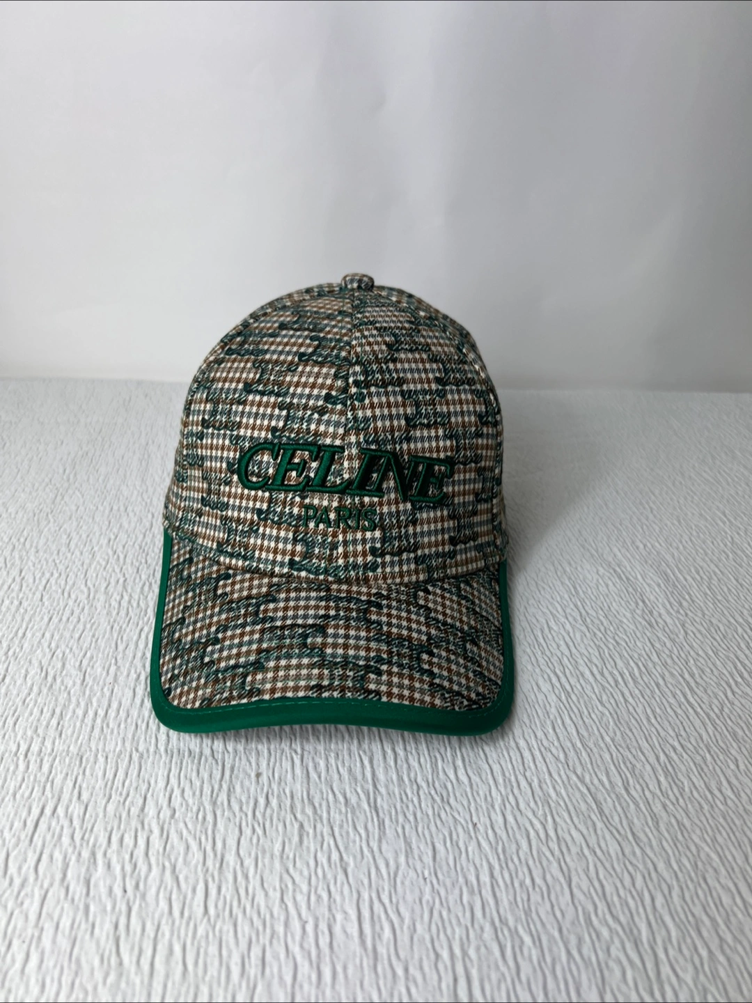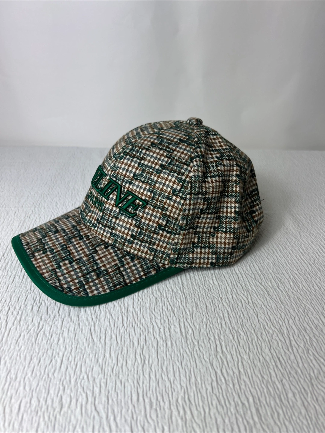 Brown and green checkered pattern. Green brim. Embroidered logo. Adjustable.